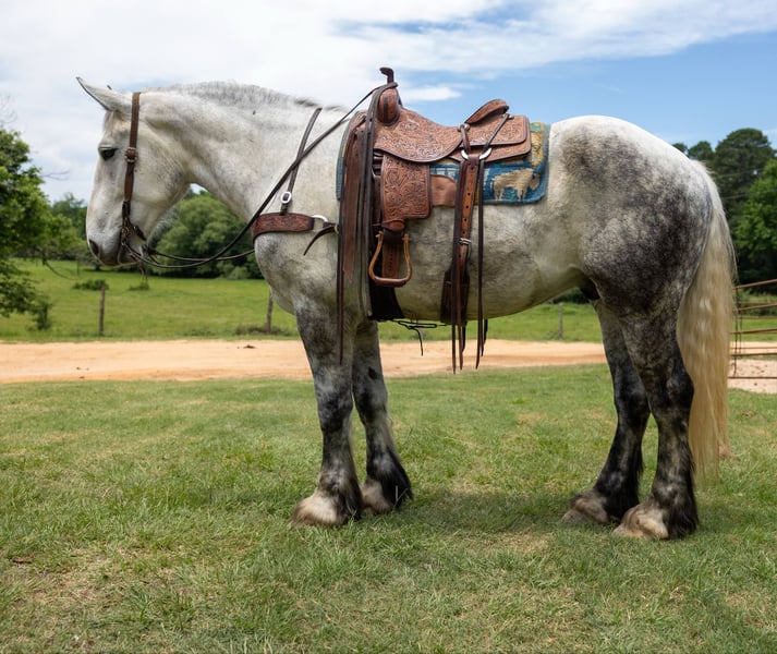 ONLINE AUCTION Place your bids at www.PlatinumEquineAuction.com Starting Bid $3500 Auction ends June 8th, 2025 Need a new saddle? Check out White Rock Saddles on our website or Facebook! Artemis is a 9 year old gray draft cross gelding! He stands 16.2 hands tall and is stout, he is 3/4 Percheron and 1/4 Quarter horse. Artemis is the absolute sweetest gelding, he will meet you at the gate and absolutely loves attention! Artemis started his career as a driving horse and has been drove both single and double, he was started under saddle as a 3 year old and has since done a little bit of everything! Artemis has been trail rode all over, he has been hauled to lots of state parks and has been on overnight camping trips, he crosses the creeks, logs and bridges! He has also been rode in parades and rode all over town. He will go anywhere you ask him and aims to please! If you’re looking for a one of a kind gelding here he is! Be sure to check out his full video! Artemis is located in Rusk TX, nationwide shipping is available! Call or text TR Livestock Rachel 605-370-4644 for more info! ONLINE AUCTION Place your bids at www.PlatinumEquineAuction.com Starting Bid $3500 Auction ends June 8th, 2025 Need a new saddle? Check out White Rock Saddles on our website or Facebook!