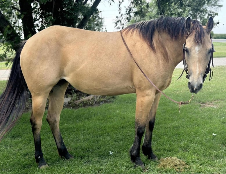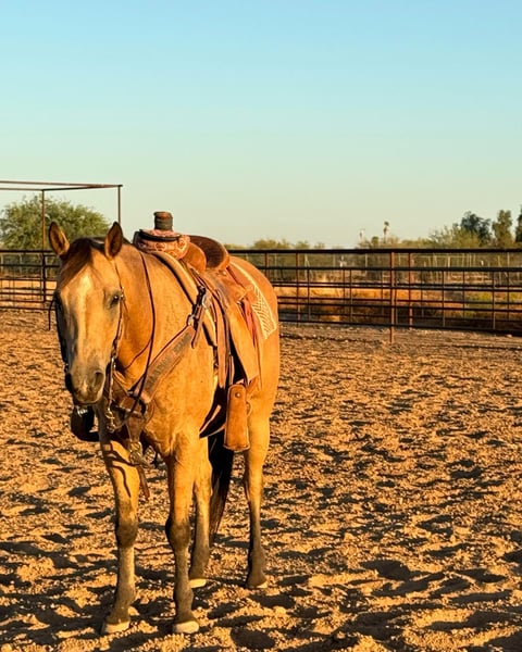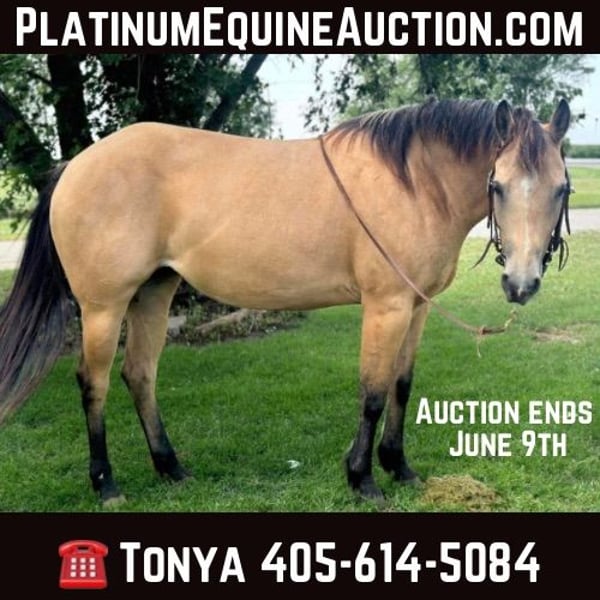 ONLINE AUCTION Place your bids at www.PlatinumEquineAuction.com Starting Bid $3500 Auction ends June 9th, 2024 Need a new saddle? Check out White Rock Saddles on our website or Facebook! Meet DUNZEE! 2015 REGISTERED APHA BUCKSKIN MARE. Let’s get the facts to you FIRST! Dunzee stands between 14.1-14.2HH. She is the great grand daughter of AQHA Hall of Fame Stallion AND $6 MILLION DOLLAR NRHA SIRE: HOLLYWOOD DUN IT! This girl has talent running thru her veins!! She has taken to the roping pen on the heel side like a true competitor!! She is the most eager to learn and so accepting!! She is MAINTENANCE FREE!! No known soundness issues since we have owned her the past 4 years. She has great feet- has been barefoot and shod. No weave, cribbing, bite, kick,cold back or cinchy! She’s your pal always! She does great in a stall or in a herd. No supplements required or needed- we prefer Zesterra liquid while traveling or lick tub when weather changes- Easy keeper! Takes correct leads, easy to correct, big stopper! She is eager to go rope! She will go wherever you point her and LOVES an all day trail ride as well! Crosses water, large downed trees, easy to navigate anywhere! This pretty gal is ready for her new best pal! Don’t miss an opportunity to own her and raise babies later- she’s had 1 foal (3 yrs ago) stud colt and was a super amazing mama!! Don’t pass her up! Located near Perry OK- Contact Tonya at Branded A Equine with any questions @ 405-614-5084. ONLINE AUCTION Place your bids at www.PlatinumEquineAuction.com Starting Bid $3500 Auction ends June 9th, 2024 Need a new saddle? Check out White Rock Saddles on our website or Facebook!