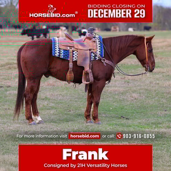 ⚜️𝐓𝐇𝐄 𝓗𝓮𝓻𝓲𝓽𝓪𝓰𝓮 𝐖𝐢𝐧𝐭𝐞𝐫 𝓒𝓵𝓪𝓼𝓼𝓲𝓬⚜️ Happening now thru MONDAY | DECEMBER 29th - Available EXCLUSIVELY on HorseBid's website! For more details and to register visit: www.Horsebid.com CONSIGNOR CONTACT: 21H Versatility Horses 903-916-0855 LOCATION: Ore City, TX BREED: Quarter horse REGISTERED: Yes REGISTERED NAME: Hicks Like Em Smart COLOR: Sorrel HEIGHT: 14.3 AGE: 10 GENDER: Gelding HICKS LIKE EM SMART – “Frank” – Key Highlights:* - *Pedigree:* Smart Little Lena (producer of 22 AQHA World Champions, over $35 M in offspring earnings) x Dual Pep (offspring earnings over $25 M) - *Build:* Heavy‑boned, muscular, and incredibly sturdy – true “tank” conformation - *Temperament:* Easy‑going, easy keeper, and reliable - *Usage:* Excels in roping, ranch work, trail riding, and show circuits - *Health & Care:* Up‑to‑date on vaccinations, deworming, and hoof care; sound and ready to go Frank is built like a tank! He’s got the bone and the booty to make you blush. Take him to town, take him to the roping pen use him on both ends and he’ll bring you to the pay window. He’s got a calm disposition, easy keeper, the kind eye that makes you know he’s going to be there for you. He isn’t just a pretty face; he’s a seasoned ranch horse that has seen the deserts of Nevada, the mountains of Colorado, and the lush green pastures of East Texas. He’s logged countless sunrise‑to‑sunset shifts, handling a full day’s worth of real ranch labor without missing a beat. This sturdy, well‑boned gelding knows exactly what it takes to get the job done—whether it’s herding, roping, or hauling heavy loads under the hot sun. Frank is the kind of horse every family needs—gentle and user friendly enough for the kids to handle in and out of the arena and trained enough for dad to count on when the roping stakes are high. He’s an easy keeper, calm, and ready to work from sunrise to sunset, making him perfect for both recreational rides and serious competition. Frank is the ultimate low‑maintenance workhorse. He stays FAT on a regular diet, stays SOUND without any “stupid” need for extra time off, or special maintenance and keeps his energy up all day long. This makes him a reliable partner for busy ranch operations that can’t afford frequent lay‑offs.