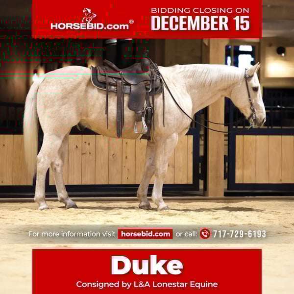🎄𝐓𝐇𝐄 𝑯𝒐𝒍𝒊𝒅𝒂𝒚 𝐂𝐋𝐀𝐒𝐒𝐈𝐂🎄 Happening now thru MONDAY | DECEMBER 15th - Available EXCLUSIVELY on HorseBid's website! For more details and to register visit: www.Horsebid.com CONSIGNOR CONTACT: L&A Lonestar Equine 717-729-6193 LOCATION: Needmore, Pa BREED: Quarter horse REGISTERED: No REGISTERED NAME: Duke COLOR: Palomino HEIGHT: 15.2 AGE: 10 GENDER: Gelding Introducing Duke, a stunning 10-year-old palomino gelding with the temperament everyone hopes to find. Standing a solid 15.2 hh, Duke is the ideal for kids, adults, and riders of all levels. He has a calm, gentle way about him that makes every ride enjoyable and stress-free. Duke is extremely broke, reliable, and steady—truly the definition of more woah than go. He’s the type you can saddle up after time off and he rides off the same every time. On the trails, he is confident and sure-footed, happy to lead or follow, and he absolutely loves being outside. He handles water, wildlife, and new surroundings with ease. In the arena, Duke is smooth, willing, and forgiving, making him an excellent choice for beginners, kids, or families wanting a safe and dependable partner. He stops well, listens, and always aims to please. He has been around all sorts of riders and consistently puts safety first. With his solid mind, sweet personality, and golden good looks, Duke checks every box for someone needing a trustworthy all-around gelding. Whether you want a trail companion, a lesson horse, or a quiet ride for the whole family, Duke is ready to step into that role. Call lane at 717-729-6193 for more information