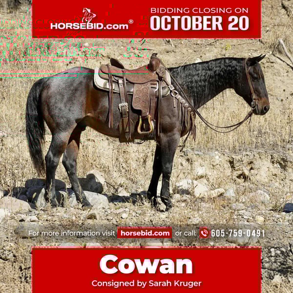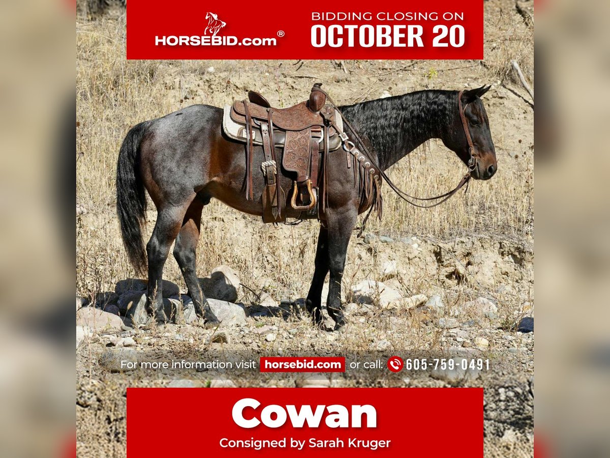♦️ 𝐭𝐡𝐞 𝐀𝐌𝐄𝐑𝐈𝐂𝐀𝐍 𝓕𝓪𝓵𝓵 𝓒𝓵𝓪𝓼𝓼𝓲𝓬 ♦️ Happening now thru MONDAY | OCTOBER 20th - Available EXCLUSIVELY on HorseBid's website! For more details and to register visit: www.Horsebid.com CONSIGNOR CONTACT: Sarah Kruger (605) 759-0491 LOCATION: Brandon SD BREED: AQHA REGISTERED: Yes REGISTERED NAME: JV cowans Driftwood COLOR: Bay roan HEIGHT: 15 AGE: 10 GENDER: Gelding Cowan is a super nice ranch gelding. He has been used extensively at the Pitzer Ranch- gathering cattle and mares and sorting pairs. He is very well broke and gentle for most any age or level, likes attention good to catch, easy keeper good with other horses, great in arena as well as awesome down the trails. Great all around family or using horse. Call or text +1 (605) 759-0491