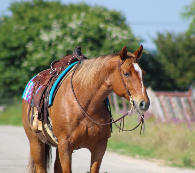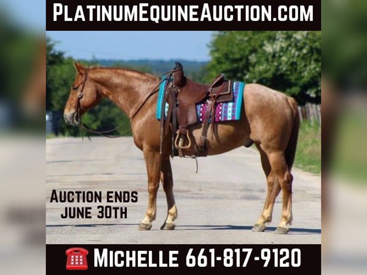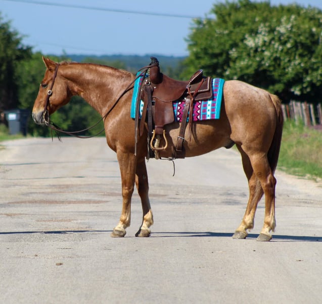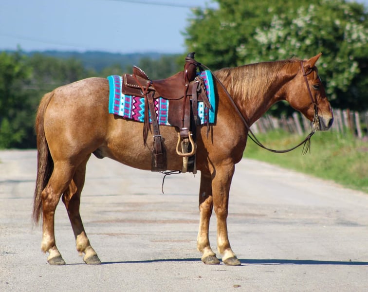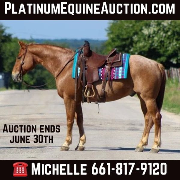 ONLINE AUCTION PLACE YOUR BIDS AT PLATINUMEQUINEAUCTION DOT COM $3500 STARTING BID AUCTION ENDS JUNE 30TH If you’re looking for one that’s calm , cool , collected and will take care of you then “Pedro “ is your man! Pedro is the PRIME age of just 9 years old , red roan and standing 15 hds tall . He’s old school built and is as wide as he is tall . There isn’t much he hasn’t seen or done , with a resume a mile long he has been hauled all over the country . He has dabbled in a little bit of everything . Pedro is absolutely a blast to ride out on the trail , we have rode him many miles at several state parks . He will cross water , logs , bridges , goes through the brush , up and down hills he goes wherever you point him . Pedro will go down the trail on a loose rein and low headed . He will go out or alone or in a group does not matter to him you can put him in the front , middle or back of the pack he’s happy wherever you want him to be . Pedro has also been rode in many parades and grand entry’s at the rodeos . We have also used him for many ranch chores including gathering cattle , sorting, loading trucks and checking fence on him . Pedro is a jack of all trades he rides phenomenal in the arena . He will walk , trot , and lope perfect circles on a loose rein always picking up the correct leads , he’s one handed broke , stops off your seat just sit down and say whoa and he will drag his butt . He gets along great out in the pasture with a herd but can also be stalled if needed . Pedro is a sweet in your pocket type of guy that loves having all the attention you want to give him . He stands tied , loads and unloads off the trailer , stands for the farrier. If you need help with transport don’t hesitate to ask we have a list of reputable haulers that can get him safely to your doorstep world wide. Located in Stephenville, TX. Contact M $ Performance Horses Michelle 661-817-9120.