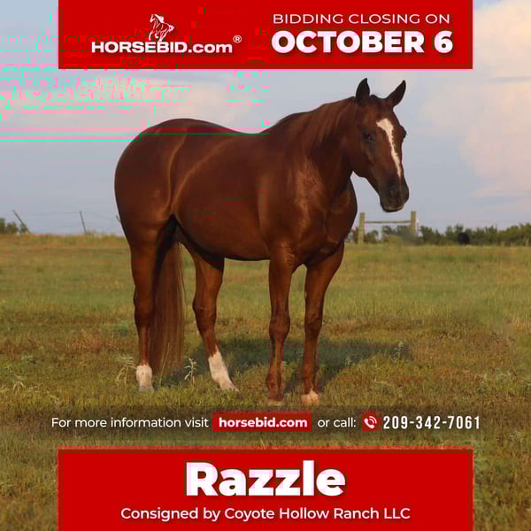 🍂 𝓐𝓾𝓽𝓾𝓶𝓷 𝑨𝑳𝑳 𝑺𝑻𝑨𝑹 𝑳𝑰𝑵𝑬𝑼𝑷 🍂 Happening now thru MONDAY | OCTOBER 6th - Available EXCLUSIVELY on HorseBid's website! For more details and to register visit: www.Horsebid.com CONSIGNOR CONTACT: Coyote Hollow Ranch LLC 209-342-7061 LOCATION: Mount Vernon TX BREED: QH REGISTERED: Yes REGISTERED NAME: Razzle COLOR: Sorrel HEIGHT: 15 AGE: 10 GENDER: Gelding Introducing Razzle, a stunning gelding with the pedigree, training, and temperament to do it all. He is sired by the legendary Dual Rey– earner of over \$105,000 and sire of more than \$40 million in money earners – and out of Gina Badger, an NCHA money earner of $58,275 and producer of over $450,000. With genetics this powerful, it’s no surprise Razzle combines talent, brains, and a willing heart into one extraordinary gelding. Razzle is a fully trained cowhorse who is confident and stylish in every maneuver. He reads a cow naturally, stays in position, and knows how to get the job done right. His beautiful turnaround is sharp, correct, and effortless, and he gives you the feel everyone wants in the pen. Lead departures are smooth and simple, and any rider can change leads and mark well on him. Top it off with his monster stop and his natural ability to watch a cow.Beyond the cowhorse world, Razzle has also been shown in Ranch Riding, proving just how versatile he is. Ranch riding demands a broke, practical, stylish horse that transitions cleanly, moves cadenced, and stays soft and willing through every maneuver. Razzle shines here, showing off his polish and quiet disposition while still having the eye-catching presence judges love. Razzle is also a finished heel horse and breakaway mount. He’s rock-solid in the box, leaves flat and correct, and runs hard with no extra fuss. He rates cattle perfectly, sets you up in the right spot every time, and delivers a strong, snappy stop. Whether you’re heeling or breakaway roping, he’s consistent, reliable, and makes every run feel easy.Safe, Gentle, and EnjoyableDespite all of his talent and training, Razzle is as gentle and safe as they come. He’s youth-friendly, beginner-safe, and the kind you can trust to pack around any rider. Outside the arena, he’s just as enjoyable – steady on the trails, comfortable gathering cattle, or simply loping quiet circles. He’s responsive without being reactive, soft in the bridle, and never gets hot or pushy. The All-Around Gelding Everyone Wants Razzle checks every single box: ✔ Elite pedigree – Dual Rey x Gina Badger (proven money earners) ✔ Finished and competitive in multiple disciplines ✔ Gentle, reliable, and safe for any level of rider ✔ Versatile both in and out of the arena Opportunities to own a gelding like Razzle don’t come around often. He’s a true all-around partner – whether your goal is to compete, rope, or simply enjoy a trustworthy, broke, and kind horse.