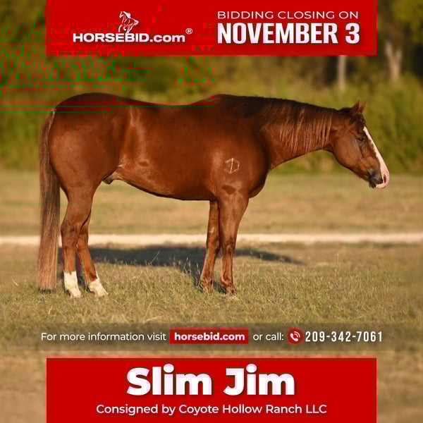 ⚜️𝐓𝐇𝐄 𝐅𝐀𝐋𝐋 𝐇𝐄𝐑𝐈𝐓𝐀𝐆𝐄 𝐂𝐋𝐀𝐒𝐒𝐈𝐂⚜️ Happening now thru MONDAY | NOVEMBER 3rd - Available EXCLUSIVELY on HorseBid's website! For more details and to register visit: www.Horsebid.com CONSIGNOR CONTACT: Coyote Hollow Ranch LLC 209-342-7061 LOCATION: Waco Tx BREED: Quarter Horse REGISTERED: Yes REGISTERED NAME: DDD MARTY PANTS COLOR: Sorrel HEIGHT: 15 AGE: 11 GENDER: Gelding Slim Jim – The Kind Every Ranch Needs Meet Slim Jim, a seasoned, salt-of-the-earth gelding with the kind of foundation you can’t train overnight. Sired by a son of Shining Spark and out of a Peppy San mare, he’s bred to have the brains, cow sense, and handle that make a true using horse. Slim Jim has spent his life on the ranch — running yearlings, doctoring calves, branding, sorting, and loading trucks. He’s seen every kind of day’s work and knows how to handle it with ease. He’ll open gates like a pro, read cattle naturally, and never lose his cool. Outside the arena, Slim Jim is a seasoned trail horse and a steady, gentle partner anyone can get along with. He’s easy to load, bathe, saddle, and shoe, and always meets you at the gate with a calm, kind eye. ✅ Proven, experienced ranch gelding ✅ Gentle, dependable, and family-approved ✅ Easy to handle in every way — load, bathe, saddle, or shoe 💥 Slim Jim – the definition of broke, dependable, and honest.