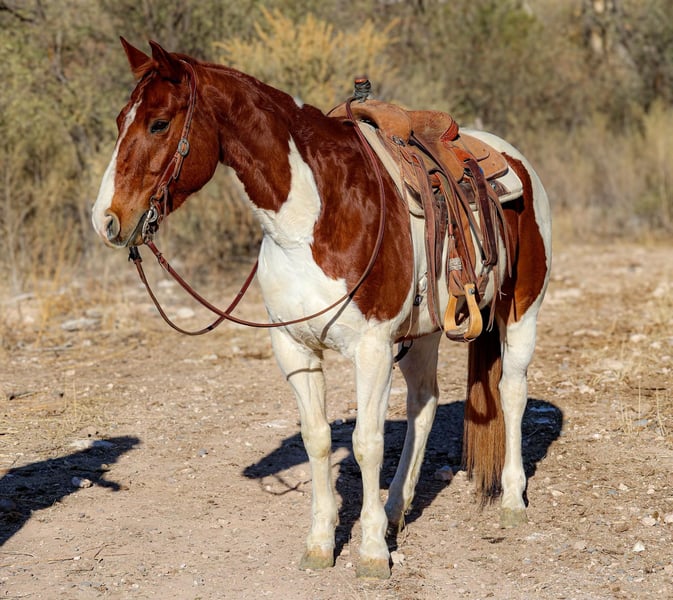 ONLINE AUCTION Place your bids at www.PlatinumEquineAuction.com Starting Bid $3500 Auction ends December 15th, 2024 Need a new saddle? Check out White Rock Saddles on our website or Facebook! Garfield is a grade 9 year old paint gelding standing 15hh. If you’re looking for a quick footed, honest, versatile gelding Garfield is your man! We’ve used Garfield dayworking all over Arizona, he will take good care of you no matter what job you throw his way. We’ve drug calves to the fire, caught and doctored yearlings, rode miles and miles of fence, and made plenty of big circles in the rough country. Not only is Garfield a great using horse, he’s just as good in the arena! Garfield will walk, trot, and lope both directions with ease, as well as neck rein and has a great stop. Located in Camp Verde, AZ. Contact D/C Equine Services Dallas 804-822-2233 with any questions. ONLINE AUCTION Place your bids at www.PlatinumEquineAuction.com Starting Bid $3500 Auction ends December 15th, 2024 Need a new saddle? Check out White Rock Saddles on our website or Facebook!