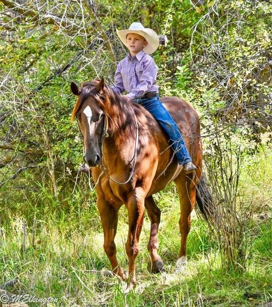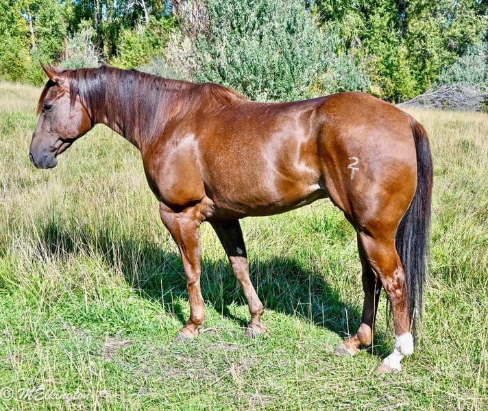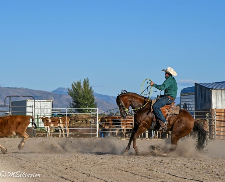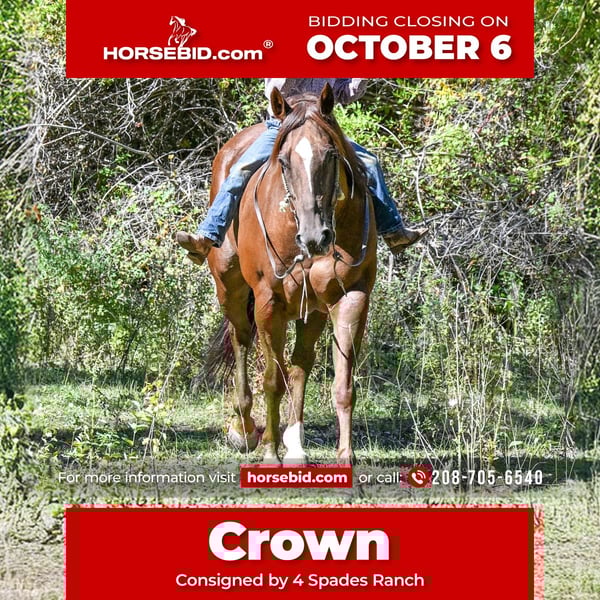 🍂 𝓐𝓾𝓽𝓾𝓶𝓷 𝑨𝑳𝑳 𝑺𝑻𝑨𝑹 𝑳𝑰𝑵𝑬𝑼𝑷 🍂 Happening now thru MONDAY | OCTOBER 6th - Available EXCLUSIVELY on HorseBid's website! For more details and to register visit: www.Horsebid.com CONSIGNOR CONTACT: 4 Spades Ranch 208-705-6540 LOCATION: Rigby, ID BREED: Quarter Horse REGISTERED: Yes REGISTERED NAME: GB Hickory Boon 2015 COLOR: Sorrel HEIGHT: 15.2 AGE: 10 GENDER: Gelding Crown is a 10-year-old, solid-as-a-rock gelding—the kind of horse that shows up every single day. Standing 15 hands, he’s done it all: heading, heeling, ranch work, hauled to World Series, team ropings, junior rodeos, jackpots, and the nightly rodeo. Crown fits a wide variety of ropers because he is forgiving and easy to ride. We’ve gathered bulls and cows on him, hauled him to state parks to watch the elk bugle, and even used him as a pick-up horse for the junior wild pony races. He’s my 12-year-old’s go-to horse, the one he trusts completely—even rode him with a broken hand and foot because he knew Crown was his safety net. My 8-year-old gathers yearlings bareback on him without a worry in the world. We use him to move pastures. He is defiantly the barn favorite around the ranch. Crown is steady, dependable, and has never once tried to jump or spook. Crown has that “grandpa style” walk—head down, reins swinging, and big steps that carry you where you need to go. If you’re looking for a trustworthy partner with miles of experience, this is the horse.