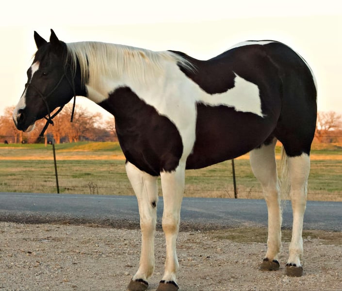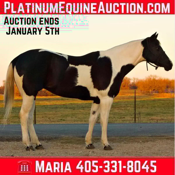 ONLINE AUCTION Place your bids at www.PlatinumEquineAuction.com Starting Bid $3500 Auction ends January 5th, 2024 Need a new saddle? Check out White Rock Saddles on our website or Facebook! MS BEDUINOS INTENTIONS is a 2015 model registered paint mare standing right at 15.2hh. She sure is a looker! Stocky built with a lot of chrome. Own daughter of the 3 Million Dollar Sire “MY INTENTION” this mare has everything she needs in her pedigree to be successful whichever direction you decide to take her. She has been a citizen of the world has done a little bit of everything: she has raining basis which gives are great foundations, nice stop, collect lope, very responsive on leg pressure, has done trail riding as well and been lightly used to sort cattle. She has a very quite mind which would make her suitable for any kind of rider with a minimum of experience, she is a smooth mover with very comfortable trot and lope, not spooky or watch by any mean she will cross water and walk in the traffic next to semi trucks. Will load and unload in any kind of trailer, stock or slant, ramp or not, she stands tied for grooming and baths, she is gentle with the farrier, she is used to be turned out with other horses and will not act mareish, easy to catch she will meet you right at the gate. Located in Terrell (TX) shipping can be arranged. consigner : DOUBLE M PERFORMANCE LLC Maria 405-331-8045. ONLINE AUCTION Place your bids at www.PlatinumEquineAuction.com Starting Bid $3500 Auction ends January 5th, 2024 Need a new saddle? Check out White Rock Saddles on our website or Facebook!