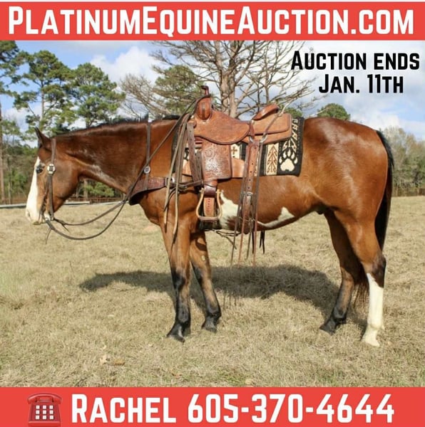 ONLINE AUCTION Place your bids at www.PlatinumEquineAuction.com Starting Bid $3500 Auction ends January 11th, 2025 Need a new saddle? Check out White Rock Saddles on our website or Facebook Hardy is a 11 year old paint gelding, He stands 14.3 hands tall and is stout! He is gentle and quiet making him perfect for riders of all ages and experience levels. Hardy has seen the trails and is confident navigating various terrains. Hardy has been hauled to lots of state parks and trail camps and is absolutely a point and go horse! He’s traffic safe and not spooky. Hardy loves attention and is great with kids. He’s easy to handle, groom, and tack up, making him a joy to have around the barn. He is easy to catch and gentle and well mannered on the ground. Located in Rusk Texas, nationwide shipping is available! Call or text TR Livestock (Rachel) at 605-370-4644 for more info! ONLINE AUCTION Place your bids at www.PlatinumEquineAuction.com Starting Bid $3500 Auction ends January 11th, 2025 Need a new saddle? Check out White Rock Saddles on our website or Facebook
