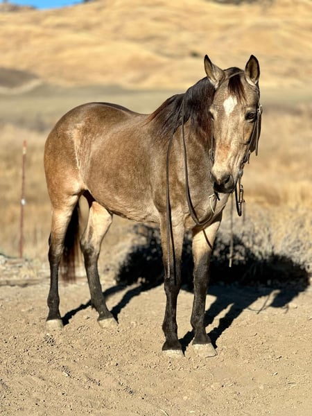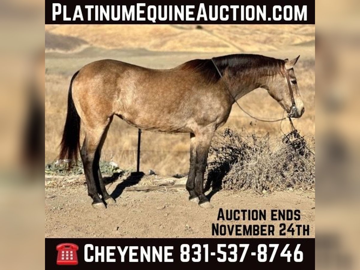 ONLINE AUCTION Place your bids at www.PlatinumEquineAuction.com Starting Bid $3500 Auction ends November 24th, 2024 Need a new saddle? Check out White Rock Saddles on our website or Facebook! Kitty is a 10yr old grade buckskin mare standing just over 14.3HH. This gorgeous girl is sweet and personable. The best thing about her is she is SAFE. Kitty has no spook, buck or silly business. She can sit for months, or be rode everyday, she will always be the same. Kitty is a superb trail horse, has lots of stamina for long rides, crosses anything in her path without hesitation, and is calm and steady. Kitty has been hauled all over the coast in all different environments from crowded beaches, scary redwood forests, and miles of country hillsides. She is familiar and not afraid of anything! Even in the arena she rides one handed easily, knows her leads, is very light in all her ques and easy to ride. She has a nice one handed turn around, soft reverse and easy going stop. Kitty is an excellent candidate for trail classes, versatility classes or just a good family horse! She goes over all the trail obstacles with ease and we have carried flags, tarps, and balls on her without an issue. Kitty has also been around farm animals like cows, goats and lots of dogs. She’s easy to catch, load and bathe. Farriers have no problem giving her a quick trim and she will let you clip her nose, face, ears and legs without a problem. Kitty has great experience out on the trail and in the arena, she will absolutely boost someone’s confidence and make them happy! For more information or to come see her contact Cheyenne Rey 831-537-8746. She is located in Bitterwater, CA. ONLINE AUCTION Place your bids at www.PlatinumEquineAuction.com Starting Bid $3500 Auction ends November 24th, 2024 Need a new saddle? Check out White Rock Saddles on our website or Facebook!