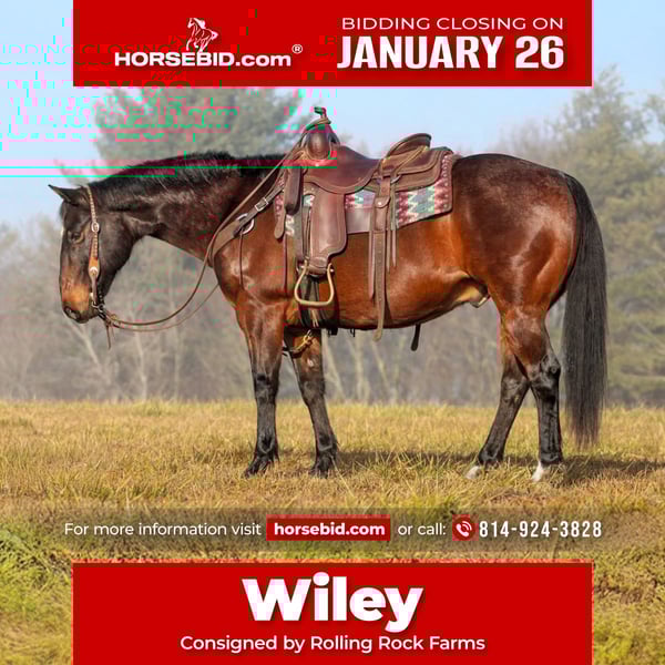 𝐉𝐀𝐍𝐔𝐀𝐑𝐘 ⭐️𝑨𝒍𝒍 𝑺𝒕𝒂𝒓 𝑳𝒊𝒏𝒆𝒖𝒑⭐️ Happening now thru MONDAY | JANUARY 26th - Available EXCLUSIVELY on HorseBid's website! For more details and to register visit: www.Horsebid.com CONSIGNOR CONTACT: Rolling Rock Farms 814-924-3828 LOCATION: Miola, PA BREED: Quarter horse REGISTERED: No REGISTERED NAME: Wiley COLOR: Bay roan HEIGHT: 14.3 AGE: 12 GENDER: Gelding Wiley is a 12 year old Quarter Horse gelding standing 14.3 hands tall. He is very calm and easy to handle on the ground with good manners. He stands quietly in cross ties, ties well, and is patient for bathing, grooming, and tacking. Wiley is uncomplicated to work around and has a steady, relaxed demeanor that makes him enjoyable to be around both in and out of the barn. Under saddle, Wiley rides nicely in the arena and understands his job. He neck reins correctly, walks, trots, and lopes willingly, and maintains good circles at all gaits. He rides off leg and seat cues and is not heavy in the bridle. Wiley has a smooth, comfortable way of going and stays quiet and consistent, making him suitable for a variety of riders. Outside of the arena, Wiley is a dependable trail horse. He rides confidently through tough and uneven terrain and is very sure footed. He has been ridden around dogs, goats, and farm equipment and handles new environments well without getting bothered. He is happy riding out alone or with other horses and remains level headed in different situations. In the pasture, Wiley gets along well with other horses and fits comfortably in the middle of the pecking order. He is easy to manage in a group setting and does not cause issues. Wiley is up to date on his rabies vaccination, has a current negative Coggins, and completed a full equine health examination on 1/12/26. He is a solid, honest gelding that would make a reliable arena and trail partner for his next owner.