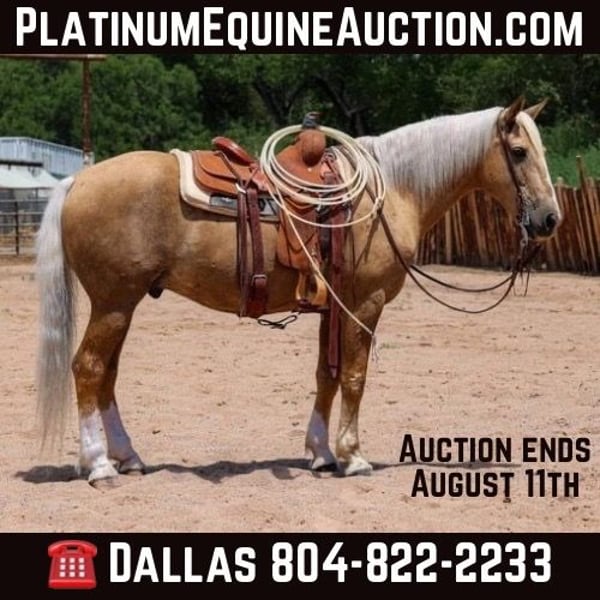 ONLINE AUCTION Place your bids at www.PlatinumEquineAuction.com Starting Bid $3500 Auction ends August 11th, 2024 Need a new saddle? Check out White Rock Saddles on our website or Facebook! If you’re looking for a big stout trail horse deluxe look no further! Zeus is a 10 year old, 15.1hh, stout made golden palomino draft cross gelding. Whether you’re ready to hit the trails, mosey through town, or need to get a job done on the ranch, Zeus is your guy! This nice gelding grew up on the ranch being exposed to lots of miles and just about anything a horse needs to see, setting him up for a great future. Zeus has recently spent his time just being a nice trail horse and has been on plenty of camping and overnight trips. Take him down the rocky trails, or the green pastures and even through town, it won’t make a difference to this guy! This awesome boy is broke to walk, trot, and lope both directions and has a nice stop! Whether you ride everyday, or just a few times a month Zeus will be the same horse every time you pull him out of his stall. Surefooted, sound, and shod all the way around wearing a size 2 shoe! UTD on shots, wormer, shoes and teeth. Zeus and our ranch are located in beautiful Camp Verde, Arizona. We can help arrange delivery to any state across the US! For more info contact D/C Equine Dallas 804-822-2233. ONLINE AUCTION Place your bids at www.PlatinumEquineAuction.com Starting Bid $3500 Auction ends August 11th, 2024 Need a new saddle? Check out White Rock Saddles on our website or Facebook!