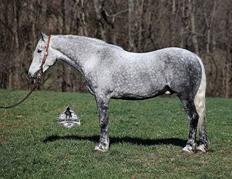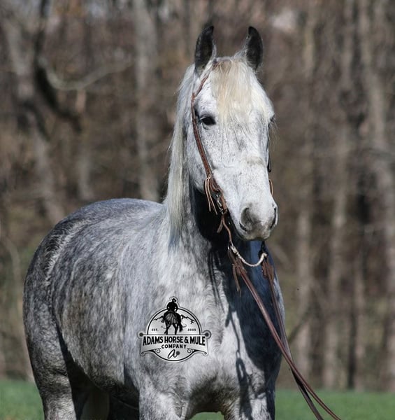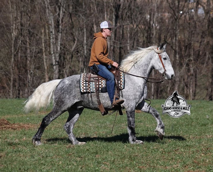 ONLINE AUCTION Place your bids at www.PlatinumEquineAuction.com Starting Bid $3500 Auction ends September 21st, 2025 Need a new saddle? Check out White Rock Saddles on our website or Facebook All Smoked Out has Dapples the size of apples! Just try to count the dapples on this guy! Smokey is a stout built draftcross gelding standing around 15.2hh, he will weigh 1250lbs, he is 9 years old, and he is that super pretty dapple grey coloring with a silver mane and tail! He is one cool looking guy! Not only does he look cool, he is has all of the other boxes checked as well… he is Mr. Personality, as friendly as they come, loves attention and is very calm natured. Smokey is out of the same breeding program as several other top draftcross geldings that we have had over the last 4 years and every one of them has the right mind with the calm nature that makes them great family horses. Smokey has been in our program since last year and has completed the natural horsemanship training and does liberty work and he also knows some tricks, he will bow, lay down and set on his rump. Smokey has been ridden by every member of our family all the way down to our 5 year old. Smokey is great on trails and he will cross creeks, ditches, logs and navigate rough rocky areas. He has a smooth jog, a VERY VERY nice easy to set lope, a good stop, turns a circle both ways and backs with ease! He has been exposed to all kinds of wildlife such as deer or turkey or other animals like cows or dogs and will go anywhere that he is asked too. He has been rode many miles in the mountains of Eastern Kentucky and encountered every obstacle possible on the trail. He will go up or down even the steepest slopes, across deep creeks, over downed trees, and over all types of rough terrain while still being sure footed. Smokey is not cinchy, cold backed, does not crib or weave. In addition to riding, Smokey has also been driven down the highways as well. Smokey is a super cool horse that anyone is sure to love!!! Feel free to call Eric 606-308-2461 with any questions. ONLINE AUCTION Place your bids at www.PlatinumEquineAuction.com Starting Bid $3500 Auction ends September 21st, 2025 Need a new saddle? Check out White Rock Saddles on our website or Facebook