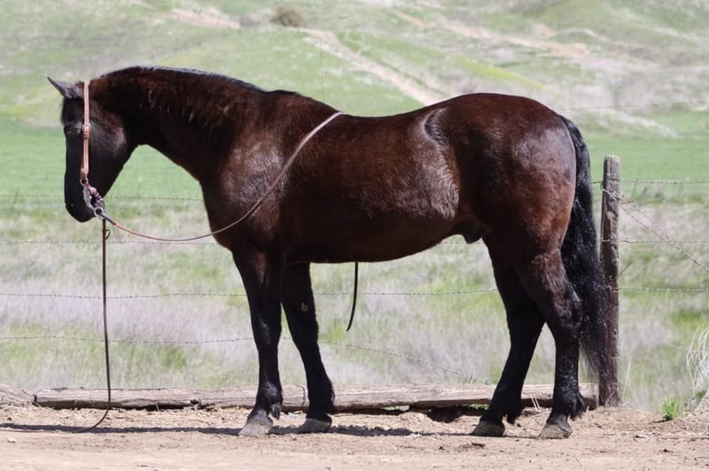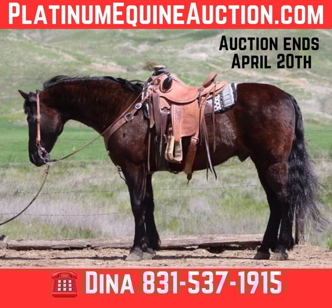 ONLINE AUCTION Place your bids at www.PlatinumEquineAuction.com Starting Bid $3500 Auction ends April 20th, 2025 Need a new saddle? Check out White Rock Saddles on our website or Facebook! Blackjack – The Ultimate Gentlemen, you don’t see many like him. He’s an 11-year-old Friesian quarter cross standing at a solid 15 hands. This guy is the perfect mix of finesse and gentleness, and let me tell you, he’s the most laid-back dude you could ever meet. You can throw anything at him, and he won’t even blink! He’s an absolute dream to ride, super easygoing, and perfect for anyone, whether you’re a newbie or a seasoned rider. He carries himself beautifully and moves like a pro. He picks up all his leads effortlessly and has a smooth-as-glass ride. Plus, he’s got a nice stop and backs up like a champ. Riding him is just a pleasure! He rides collected and has the perfect one hand neck rein. Blackjack’s done everything from cattle work to trail obstacles. He’s seen it all: bridges, flags, tires, tarps – you name it! On the trail, he’s got this calm easy going vibe that makes him shine. No surprises for this guy; he’s tackled all kinds of terrain, wildlife, downed trees, and thick brush like a pro. If you’re looking for a horse that anyone can ride, Blackjack is your guy. You can ride him bareback in halter and crawl all over him he’s a saint. He’s even been down busy streets with cars zooming by, and he just strolls along like it’s no big deal. He ties, clips, and bathes like a champ, and he just loves hanging out with his humans. He loads and hauls well, is great for the farrier, and comes right to you when you call. Honestly, if you’re in the market for a safe, trustworthy, and all-around gentleman of a horse, you’ve got to check out Blackjack. If you want more info, contact Dina at Longhorn Ranch at 831-537-1915. We are located in Paicines, CA. ONLINE AUCTION Place your bids at www.PlatinumEquineAuction.com Starting Bid $3500 Auction ends April 20th, 2025 Need a new saddle? Check out White Rock Saddles on our website or Facebook!