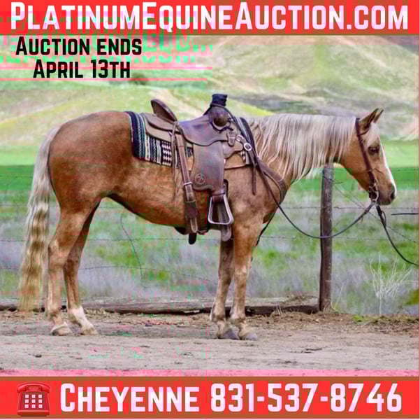 ONLINE AUCTION Place your bids at www.PlatinumEquineAuction.com Starting Bid $3500 Auction ends April 13th, 2025 Need a new saddle? Check out White Rock Saddles on our website or Facebook! Bam Bam is an exceptional little mare. Her attitude, and handle do completely match her flawless look. Bam is 12 years old and the stoutest built 14.1HH you’ve ever seen. Even tho she is grade she is sired by a buckskin AQHA “MR HOLLYWOOD ROOSTER”. This is the most easy going little horse you can find. She is absolutely safe for any and everyone. She has been used as a ranch, lesson, English and trail horse and she is very adaptive to every scene. She is a fancy, fluid mover and catches eyes everywhere she goes! Beginners get along with her more “whoa than go” attitude, then advanced riders enjoy her poise and fancy performance handle. Bam Bam is used to long trail rides in all types of terrain, all the farm animals, and crowded roads. She doesn’t spook, or get nervous ever. She is always calm, cool and collected. She is the prettiest little English pony and knows all the basic maneuvers. She’s happy to go anywhere she’s pointed out on the trail, and is just as happy in the arena. Bam Bam has a nice low headset, W-T-L both directions effortlessly, has a great collected stop and reverse. She is easy to one hand direct rein, and respects leg pressure easily. Bam Bam clip, ties, loads and bathes, flat footed and quietly. She is great with her feet and has excellent ground manners. She is safe to have around your entire family from toddlers, to mother in laws. We are sure you’ll love Bam as much as we do, no matter the environment! She is located in Bitterwater, CA. For more info, contact Cheyenne at 831-537-8746. ONLINE AUCTION Place your bids at www.PlatinumEquineAuction.com Starting Bid $3500 Auction ends April 13th, 2025 Need a new saddle? Check out White Rock Saddles on our website or Facebook!