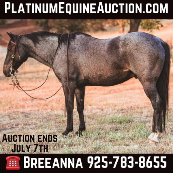 ONLINE AUCTION Place your bids at www.PlatinumEquineAuction.com Starting Bid $3500 Auction ends July 7th, 2024 Need a new saddle? Check out White Rock Saddles on our website or Facebook! Do you want the ultimate trail partner ? Maybe you do obstacle challenges ? What better than a great horse with the LOOKS to go with it! Aero is a 11yo grade blue roan gelding. Standing 14.3 hh and thick! Aero is the best adventure buddy. He goes thru anything and everything. He’s sure footed. Travels with a low headset and perfect pace. Aero has been hauled out extensively. Get on and go. No need to lunge. Saddles and bridles with ease. Stands tied. Loads great. Hauls quiet. Aero has been exposed to just about everything. He goes over bridges, crosses water, tarps, tires, noodles, drags logs, used to dogs, cars, tractors, dirt bikes, carries a flag you name it. This horse has no buck bolt rear. He’s true and honest. Bathes with ease, good in a stall. Easy keeper. I’ve yet to find anything that spooks this guy. He’s got a very calm demeanor. Currently barefoot with good feet. He does have a nice movement. He will pick up his leads in the arena, stops backs up, turns around, however trails are his gig. If you want something you can go crack a beer (or soda) open and hit the trails or beach with your friends he’s the one! I’ve enjoyed having aero in my barn and I’m sure you will to!! Please feel free to contact me with any questions. Breeanna Frazier 925-783-8655 located in Valley Springs, CA. ONLINE AUCTION Place your bids at www.PlatinumEquineAuction.com Starting Bid $3500 Auction ends July 7th, 2024 Need a new saddle? Check out White Rock Saddles on our website or Facebook!