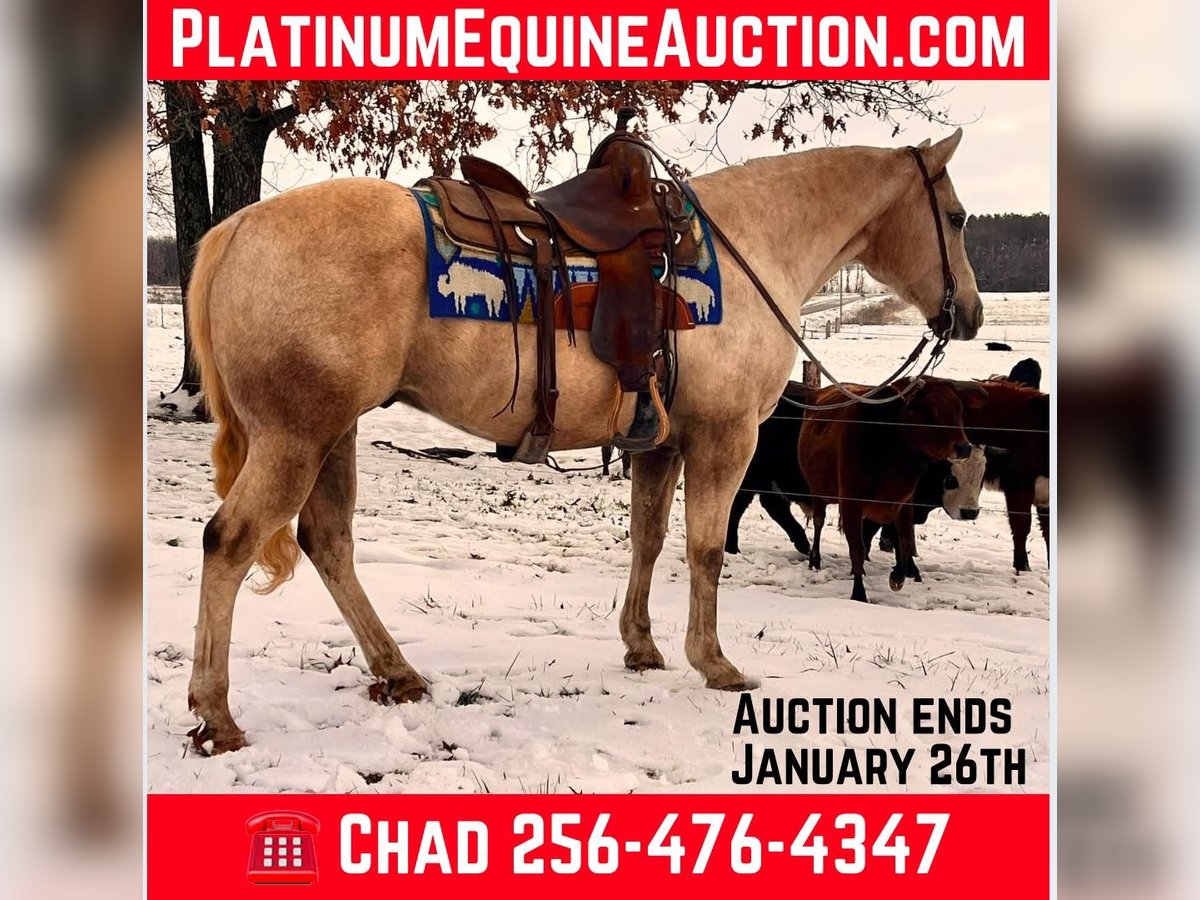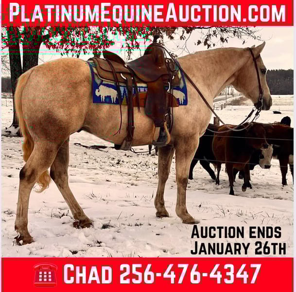 ONLINE AUCTION Place your bids at www.PlatinumEquineAuction.com Starting Bid $3500 Auction ends January 26th, 2025 Need a new saddle? Check out White Rock Saddles on our website or Facebook! If you need laid back, slow and easy, safe and dependable but also would prefer it to have some good looks??? Nugget is your guy! He is 12 years old, stands 14.3 hands tall, is very stocky built and is a true gentleman! He is that beautiful golden palomino color that everyone loves too and also has a heart of gold! He has been trail ridden extensively by young children and his favorite speed is slow! He is the type of horse that will build his riders confidence levels and he loves to be brushed loved on! He loves to eat treats too! He is one hand broke, has a smooth trot/lope, is good for any level rider, traffic safe, good around cattle and would be a great family horse! He has no issues and is extremely gentle forgiving gelding if you are looking for a well mannered, extremely gentle gelding don’t miss this guy! For more info or to make a Buy It Now Offer, contact Chad Little 256-476-4347 Located in Mt. Hope, AL. ONLINE AUCTION Place your bids at www.PlatinumEquineAuction.com Starting Bid $3500 Auction ends January 26th, 2025 Need a new saddle? Check out White Rock Saddles on our website or Facebook!