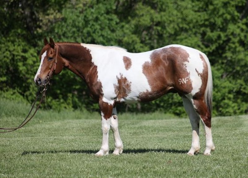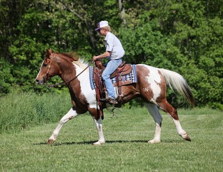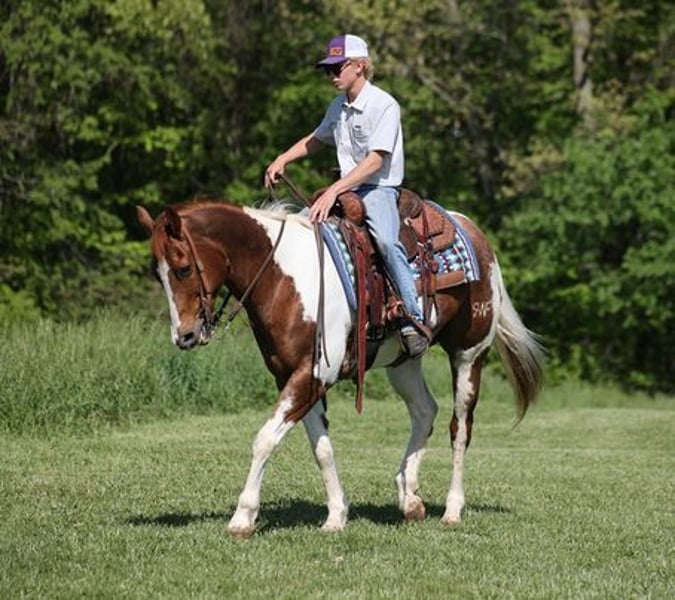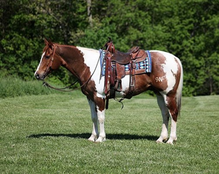 ONLINE AUCTION Place your bids at www.PlatinumEquineAuction.com Starting Bid $3500 Auction ends October 27th, 2024 Need a new saddle? Check out White Rock Saddles on our website or Facebook! Benny is a stout built 15.1H, 11 year old, Sorrel Tobiano Paint Quarter Horse Gelding. Benny is a well traveled horse that has been ridden in several states and has been used as a ranch horse in every aspect of ranch life. He has been grandma’s trail horse and plodded along down the trails. He has herded sorted, pasture roped and doctored, Benny has done it all! He has been trail ridden in several states and used at the stockyards to pen cattle on a few occassions. He will cross creeks, ditches, logs and navigate rough rocky areas. Benny is safe riding in traffic. He has a smooth jog and a good lope! Benny has been exposed to all kinds of wildlife such as deer or turkey or other animals like cows or dogs and will go anywhere that he is asked too. He has been rode many miles in the mountains of Eastern Kentucky and encountered every obstacle possible on the trail. He will go up or down even the steepest slopes, across deep creeks, over downed trees, and over all types of rough terrain while still being sure footed. If you want to feel and look like a real deal cowboy/cowgirl just climb on Benny and he will make you look like one! If you have any questions call Moore Trained Horses Logan 765-265-0033. Located in Level Green, KY. ONLINE AUCTION Place your bids at www.PlatinumEquineAuction.com Starting Bid $3500 Auction ends October 27th, 2024 Need a new saddle? Check out White Rock Saddles on our website or Facebook!