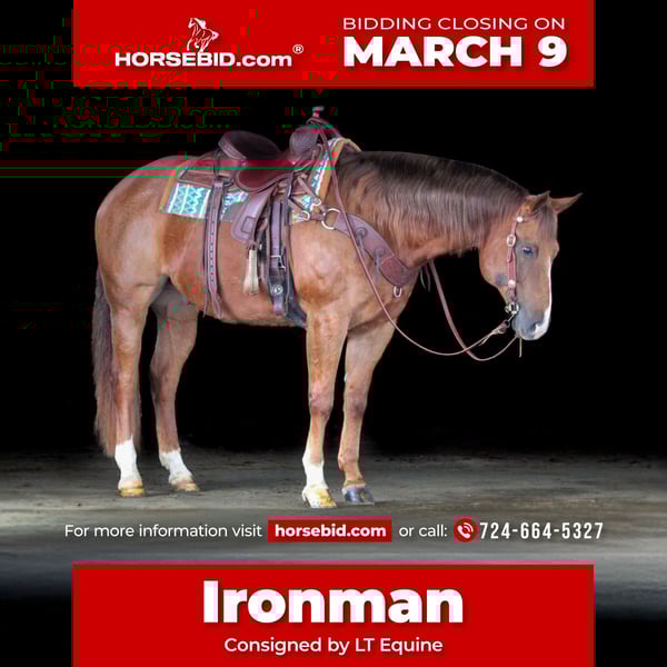 ℳ𝒶𝓇𝒸𝒽 ♦️𝐑𝐈𝐃𝐄𝐑'𝐒 𝐂𝐇𝐎𝐈𝐂𝐄♦️ Happening now thru MONDAY | MARCH 9th - Available EXCLUSIVELY on HorseBid's website! For more details and to register visit: www.Horsebid.com CONSIGNOR CONTACT: LT Equine 724-664-5327 LOCATION: Miola, PA BREED: AQHA REGISTERED: Yes REGISTERED NAME: Iron Pine Bar COLOR: Chestnut HEIGHT: 15.2 AGE: 13 GENDER: Gelding Introducing Ironman, this absolutely gorgeous chestnut gelding stands 15.2 hands tall and built to perfection. He is registered with the American Quarter Horse Association born on May 26, 2012. Ironman is grandson of the Famous “Zippo Pine Bar”, and he very much resembles him! Ironman would be the absolute perfect addition to a family that’s looking for a weekend show/4H home. He has lots of training in the pleasure style riding. Whether it be western, English or ranch and trail, halter and showmanship. He is a money earning and reserve champion in the lounge lining as a yearling at the Minnesota QHA Futurity in 2012. Ironman is very easy and uncomplicated to ride. He naturally has a low level head, slow jog on a loose rein, one step lope picking up both leads. He pivots beautifully with a loose one hand neck rein. Moves off leg, side passes and backups with ease. Will open and close gates. And is very forgiving when it comes to cue. He’s not the type of horse that needs to be rode constantly to stay broke. He’s at the perfect mature age that he knows his job. The past few years Ironman has been a family trail and lesson horse, Traveling all over the western US trail riding. Ironman has great ground manners and walks and jogs easily in hand. He stands for the vet and farrier. Loves to be groomed and bathed. He loads and stands tied nicely. He does well in a stall or turned out in the pasture! Please give Ironmans video a watch and call or text for more information to see if Ironman is the perfect fit for you!