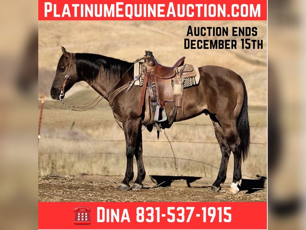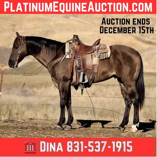 NLINE AUCTION Place your bids at www.PlatinumEquineAuction.com Starting Bid $3500 Auction ends December 15th, 2024 Need a new saddle? Check out White Rock Saddles on our website or Facebook! If you’re looking for the perfect Christmas present for the whole family. Alvie is a remarkable 11 year-old gelding is a true 15 hands and a striking grulla coat that gleams in the sunlight. Alvie is not just visually stunning; he boasts extensive experience as an exceptional trail horse tailored for families and beginner riders alike His history includes participation in overnight trail rides and 4-H shows, demonstrating his adaptability across various environments from serene paths to bustling ranch work involving cattle. Alvie is great with obstacles, flags,tarps and is traffic safe. With a well rounded skill set tailored for both recreational riding and competitive disciplines like competitive trail riding and ranch riding games, Alvie embodies versatility at its finest.This kid-safe companion has been meticulously trained to navigate logs and water with ease, proving himself reliable whether out alone or alongside other horses. A natural lesson horse, in the arena he provides consistent performance even after time off, showcasing smooth transitions and maintaining great cadence throughout all gaits qualities essential for any aspiring equestrian. His laid-back disposition makes him easy to catch. Alvie stands patiently for both vet visits and farrier appointments; loading into trailers presents no challenge either a testament to his calm nature. He is safe for children to handle. Alvie is a saint he will stand like a soldier all day long. For those considering bringing this treasure home, transportation options are readily available. Schedule your appointment today to experience firsthand why Alvie is the perfect addition for any family seeking companionship and loyalty wrapped up in this beautiful boy. Please contact Longhorn Ranch Dina @ 831-537-1915 located in Paicines ca to come meet this special boy. ONLINE AUCTION Place your bids at www.PlatinumEquineAuction.com Starting Bid $3500 Auction ends December 15th, 2024 Need a new saddle? Check out White Rock Saddles on our website or Facebook!