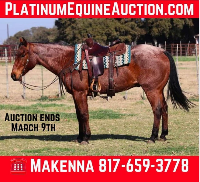 ONLINE AUCTION Place your bids at www.PlatinumEquineAuction.com Starting Bid $3500 Auction ends March 9th, 2025 Need a new saddle? Check out White Rock Saddles on our website or Facebook! Brimsley has a heart of gold and is as quiet one could hope to find. Brim always wants to be your best friend, and is sucker for love and attention. He is a grade 12 year old gelding standing at 15hh tall. Brimsley is quiet to be around, good with his feet, and a gentleman on the ground. He’s been exposed to almost anything you can imagine including guns, whips, tarps, flags, ropes, or whatever else might look strange to a horse. He wants to ride slow, and relaxed. He picks up both leads nicely and lopes off with ease. Above all Brimsley really shines, and excels being out on the trails. He’s calm, steady, and quiet handling himself in rough country, maneuvering with ease over bridges, bogs, crossing water, etc… Brims has been ridden by all levels of riders, and is forgiving of mistakes made by those who are new, helping to build their confidence. He would really go far in trail versatility classes or would help you to capture the eyes emotions carrying a flag. Whether you’re on the ranch, and in the arena, everyone notices him by his looks, and quiet demeanor. Brimsley is a seasoned heel horse and would be great for someone to learn on! Brimsley is located in Lipan, TX. We are more than willing to help with all shipping needs, we ship all over the country as well as Hawaii and Canada. For more information please reach Makenna Hartzell 817-659-3778. ONLINE AUCTION Place your bids at www.PlatinumEquineAuction.com Starting Bid $3500 Auction ends March 9th, 2025 Need a new saddle? Check out White Rock Saddles on our website or Facebook!