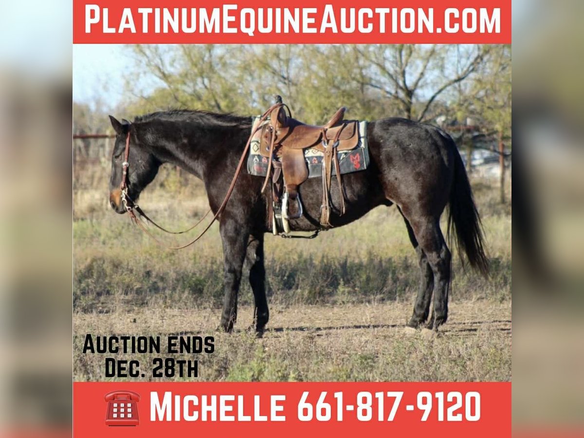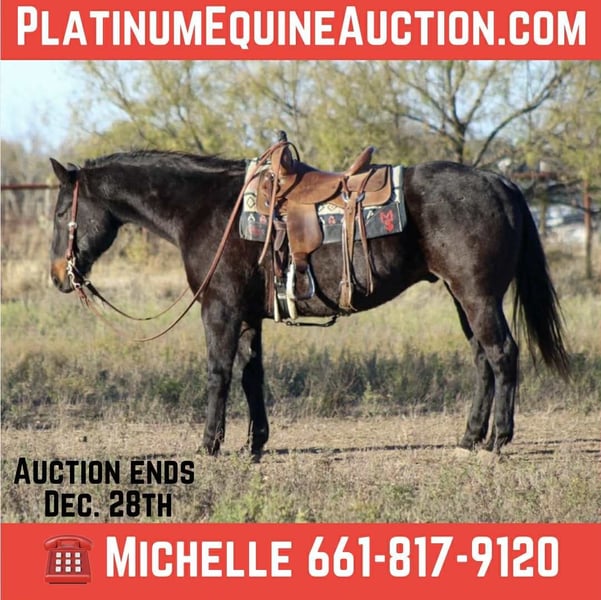 ONLINE AUCTION Place your bids at www.PlatinumEquineAuction.com Starting Bid $3500 Auction ends December 28th, 2025 Need a new saddle? Check out White Rock Saddles on our website or Facebook Tried, Seasoned, and True — Meet Dollar! Dollar is a 13-year-old bay roan gelding standing a solid 15.1 hands tall, and he is every bit the seasoned veteran he looks to be. This is the kind of gelding you can throw absolutely any job at and know he’ll step up, stay steady, and get it done right. Dollar is a tried-and-true ranch horse who has been used extensively outside for every ranch chore you can think of. He knows what a long day’s work is, and all those miles are exactly why he’s the reliable, confident, and rock-solid mount he is today. There is truly nothing you’re going to show this gelding that he hasn’t already seen. In the arena, he’s just as impressive — he’s got an easy, honest walk, trot, and lope, and he is incredibly user-friendly. He would shine in a lesson program thanks to his steady mind and willing attitude. Out on the trails, he’s point-and-go simple. Steep mountains, bridges, water crossings, wildlife — Dollar handles it all with a seasoned, levelheaded confidence. His first trip to the Fort Worth Stockyards was no different. He walked through the crowds, lights, noise, and chaos like he’d done it a thousand times. Nothing shakes this gelding. Dollar is the kind that’s hard to find: exceptional minded, experienced, trustworthy, and ready for absolutely anything. Whether you want to head back to ranch country, explore new trails, or add a safe, dependable gelding to the family, Dollar is the one everyone will enjoy. We are open to anyone interested in him to schedule a time to come see him or if you can’t make it schedule a FaceTime showing to see him. If you need help with transport don’t hesitate to ask we have a list of reputable haulers that can get him safely to your doorstep WORLD WIDE including, Alaska , Mexico, Hawaii, Canada and anywhere in between from Stephenville, TX. For more info contact Michelle with M $ Performance Horses 661-817-9120 ONLINE AUCTION Place your bids at www.PlatinumEquineAuction.com Starting Bid $3500 Auction ends December 28th, 2025 Need a new saddle? Check out White Rock Saddles on our website or Facebook