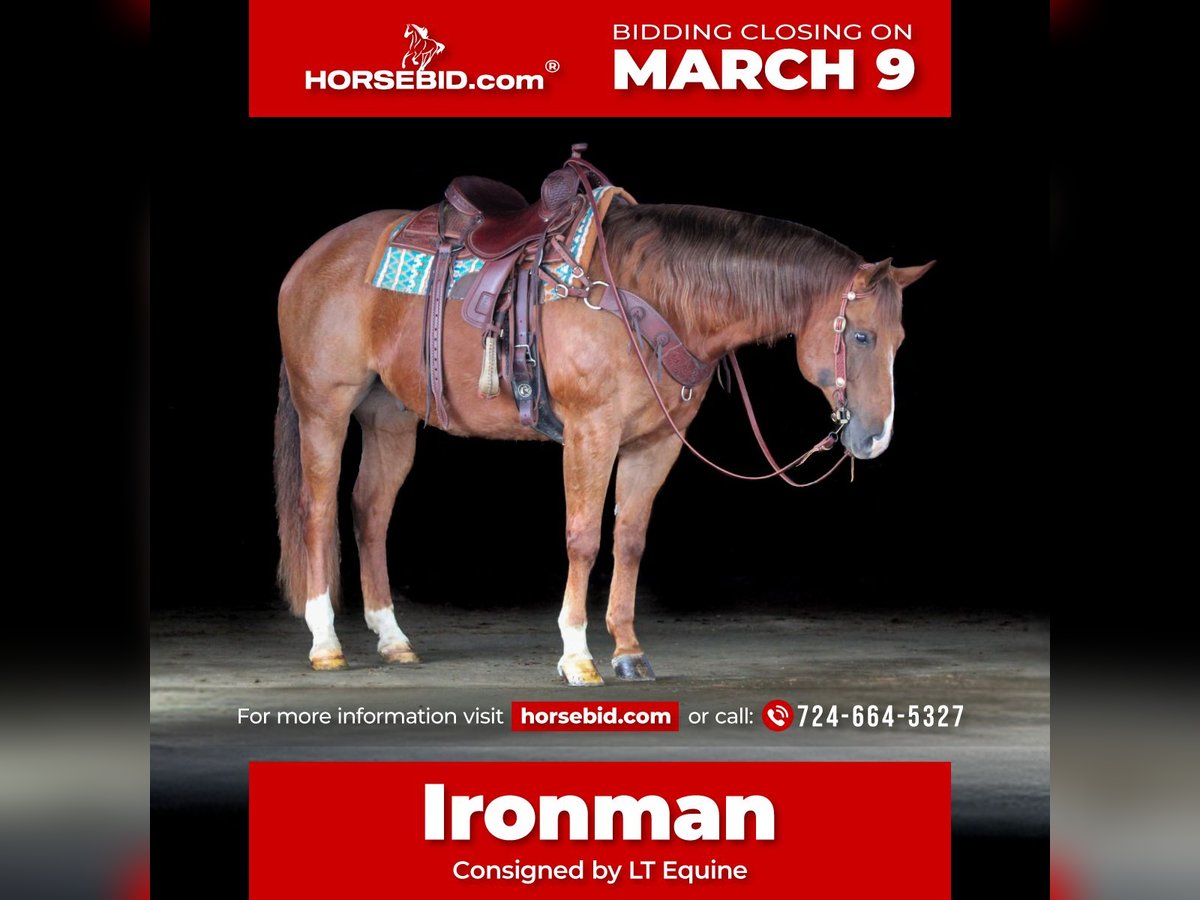 ℳ𝒶𝓇𝒸𝒽 ♦️𝐑𝐈𝐃𝐄𝐑'𝐒 𝐂𝐇𝐎𝐈𝐂𝐄♦️ Happening now thru MONDAY | MARCH 9th - Available EXCLUSIVELY on HorseBid's website! For more details and to register visit: www.Horsebid.com CONSIGNOR CONTACT: LT Equine 724-664-5327 LOCATION: Miola, PA BREED: AQHA REGISTERED: Yes REGISTERED NAME: Iron Pine Bar COLOR: Chestnut HEIGHT: 15.2 AGE: 13 GENDER: Gelding Introducing Ironman, this absolutely gorgeous chestnut gelding stands 15.2 hands tall and built to perfection. He is registered with the American Quarter Horse Association born on May 26, 2012. Ironman is grandson of the Famous “Zippo Pine Bar”, and he very much resembles him! Ironman would be the absolute perfect addition to a family that’s looking for a weekend show/4H home. He has lots of training in the pleasure style riding. Whether it be western, English or ranch and trail, halter and showmanship. He is a money earning and reserve champion in the lounge lining as a yearling at the Minnesota QHA Futurity in 2012. Ironman is very easy and uncomplicated to ride. He naturally has a low level head, slow jog on a loose rein, one step lope picking up both leads. He pivots beautifully with a loose one hand neck rein. Moves off leg, side passes and backups with ease. Will open and close gates. And is very forgiving when it comes to cue. He’s not the type of horse that needs to be rode constantly to stay broke. He’s at the perfect mature age that he knows his job. The past few years Ironman has been a family trail and lesson horse, Traveling all over the western US trail riding. Ironman has great ground manners and walks and jogs easily in hand. He stands for the vet and farrier. Loves to be groomed and bathed. He loads and stands tied nicely. He does well in a stall or turned out in the pasture! Please give Ironmans video a watch and call or text for more information to see if Ironman is the perfect fit for you!