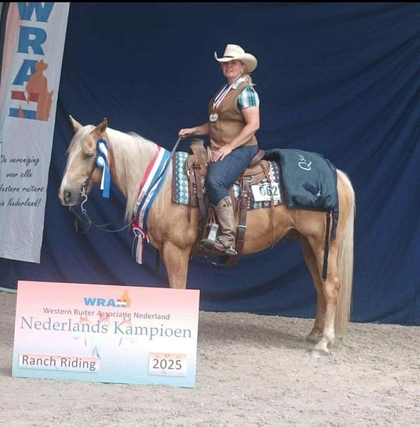 Met pijn in mijn hart verkoop ik mijn 13-jarige ruin vanwege tijdgebrek. Hij is pas op 10-jarige leeftijd begonnen in de wedstrijdsport, dus totaal onversleten. In deze korte tijd heeft hij talloze plaatsingen en overwinningen behaald in Ranch Riding, Western Ranch Rail, Trail, Ranch Trail en Western Horsemanship (EWU LK 1/2). Ook in Nederland waren we succesvol en zijn we tweevoudig Nederlands kampioen in Ranch Riding (LK 1+2) en tweevoudig vice-kampioen in Trail en Ranch Trail. Nuke is veelzijdig opgeleid, heeft al meerdere keren met runderen gewerkt, heeft plezier in Speed Rodeo, kent alle Extreme Trail hindernissen, is natuurlijk terreinveilig en is nergens bang voor. Hij is zeer stevig gebouwd, heeft ongeveer 3 jaar geleden de AKU met glans doorstaan en heeft super hoeven en zeer goede tanden. Geen gezondheidsbeperkingen, kerngezond! Hij staat in een open stal, kent ook een box, kan 24/7 hooi en gras verdragen. Hij is altijd rustig op wedstrijden, cursussen en op vakantie. Hij kan alle manoeuvres, maar is niet verder op de stop gewerkt, omdat er geen sliders zijn. Hij wisselt vliegend, maar kan nog verfijnd worden. Geen ongewenste eigenschappen, eerder ranghoog. Kan zeker door kinderen of ook herintreders gereden worden, maar houdt niet van grove hulpen. Hij loopt het liefst met bit of bosal. Heeft plezier in grondwerk/vrijheidswerk en wil graag werken. Helaas hebben we te veel paarden en moet het jongere paard bereden worden, daarom te koop wegens tijdgebrek. Gewoon te jammer om stil te staan!