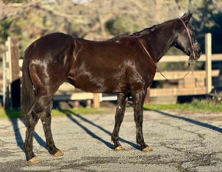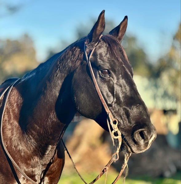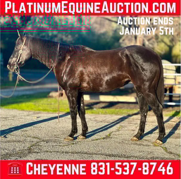 ONLINE AUCTION Place your bids at www.PlatinumEquineAuction.com Starting Bid $3500 Auction ends January 5th, 2024 Need a new saddle? Check out White Rock Saddles on our website or Facebook! BARST VENOMOUS RONA aka Big Ron is a 2013 black AQHA gelding. Ron stands just over 15.3HH and is a tank! This big fella is a gentle giant and loves his people. Ron has been used in all different aspects of riding, from ranch work with sheep, and cattle, arena riding, English riding, and trails. He is a jack of all trades! Ron has a more whoa than go demeanor, with a laid back, go with the flow personality. Nothing riles this guy up and he is calm and sane in any situation. He has no spook, no buck, and is safe for anyone, with any level of experience. This guy never has any refusal, and has been one that has packed new riders all over town roads, steep trails, as well as, around the arena. He travels out in rough terrain, going anywhere you point him without hesitation. In the arena, he has very fluent smooth gaits and is very light in the bridle. He neck reins, moves off leg pressure, collects at the poll, and is just very easy to get along with. He is patient enough for riders with less experience, and handy enough for the experienced to enjoy. He has been patterned on the barrels and lopes a pretty pattern. Ron has been roped off out in the pasture and started on the sled in the arena. You can do all the daily ranch chores on top of this guy. You can open and close gates, sort cattle, rope calves that need doctored and have a great trail partner out riding fence lines! Ron doesn’t get fresh, and never has a bad attitude, he is always happy to get to work, or even happier to take a relaxing trail ride anywhere you choose. This is a fantastic BIG gelding who has the experience and exposure to a lot of different places, this ensures no matter what his new home is, he is ready to make sure his new owners enjoy it! He is located in Bitterwater, CA. For more info contact Cheyenne Rey 831-537-8746. ONLINE AUCTION Place your bids at www.PlatinumEquineAuction.com Starting Bid $3500 Auction ends January 5th, 2024 Need a new saddle? Check out White Rock Saddles on our website or Facebook!