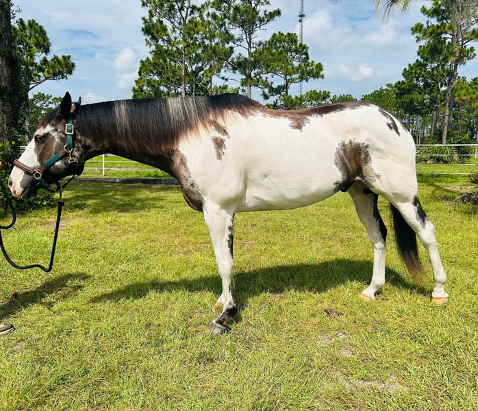 ONLINE AUCTION Place your bids at www.PlatinumEquineAuction.com Starting Bid $3500 Auction ends August 4th, 2024 Need a new saddle? Check out White Rock Saddles on our website or Facebook! Domino is your next flashy dream horse! He is an 11yr old registered paint gelding standing at 16.1hh. This easy going guy is a kick ride, and can go either way English or Western. He enjoys being worked and have a job, you can take him for a swim bareback or hack out with friends. His quirky personality is a joy to have at the barn. Very willing and trusting of his rider to try new things, he does need an experienced rider. He has a very smooth trot and great lateral movement – check out his awesome video! He ties, loads and stands for farrier with some treats. Next shod scheduled for 7/19/24. UTD on all shots and coggins. Ready for his forever home. Please do not hesitate to reach out via text or phone at Rebecca Rodriguez 407-496-0088 for any additional information or questions! Located in Christmas, FL. ONLINE AUCTION Place your bids at www.PlatinumEquineAuction.com Starting Bid $3500 Auction ends August 4th, 2024 Need a new saddle? Check out White Rock Saddles on our website or Facebook!