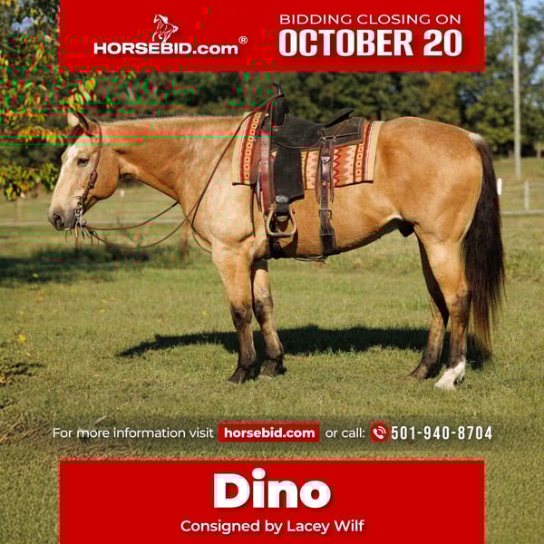 ♦️ 𝐭𝐡𝐞 𝐀𝐌𝐄𝐑𝐈𝐂𝐀𝐍 𝓕𝓪𝓵𝓵 𝓒𝓵𝓪𝓼𝓼𝓲𝓬 ♦️ Happening now thru MONDAY | OCTOBER 20th - Available EXCLUSIVELY on HorseBid's website! For more details and to register visit: www.Horsebid.com CONSIGNOR CONTACT: Lacey Wilf 501-940-8704 LOCATION: Quitman, AR BREED: Quarter Horse REGISTERED: No COLOR: Buckskin HEIGHT: 16.2 AGE: 12 GENDER: Gelding Dino is a striking 16.2 hand, 12-year-old buckskin gelding with the kind of size, presence, and bone that commands attention. He’s big, gentle, and absolutely user-friendly—the kind that carries himself with confidence and rides as right as they come. He’s been headed on some and handles a rope with ease, pulls stout to the horn, faces well, and scores good, all while staying calm and collected. On the ranch, Dino has seen plenty of real work while gathering, sorting, doctoring and checking cattle across big country. He’s a seasoned veteran in the sale barn as well. Comfortable in tight alleys and noisy pens, working gates, penning all classes of stock, and taking the fast pace, echoes, and commotion in stride. On the trail he’s straightforward and the “point-and-go” type. Dino crosses water, bridges, brush, and rough country without hesitation, is sure-footed on rock, and will ease along alone or settle into a group without fuss. He stands to mount, neck reins one-handed, moves off your leg, and carries a soft, collected lope that makes long miles easy. On the ground he’s just as cooperative—easy to catch, saddle, bridle, load, haul, bathe, and shoe. He ties quiet and is the same horse after time off as he is with steady riding. Best of all, Dino suits most all levels of rider without issue. He’s honest enough for a careful novice to learn on, big and broke enough for a hand to go make a living with, and kind enough to give guests a confidence-building ride. Dino has the kind of loving, easygoing character that wins everyone over—he genuinely enjoys people, meets you at the gate with a soft eye, and carries a calm, kind presence that makes him impossible not to love. If you want a large, classy gelding that handles the job and keeps it uncomplicated—in the arena, on the ranch, or down trail. Dino can master any job and make you look good doing it!