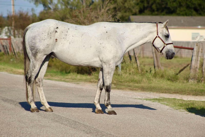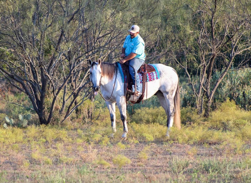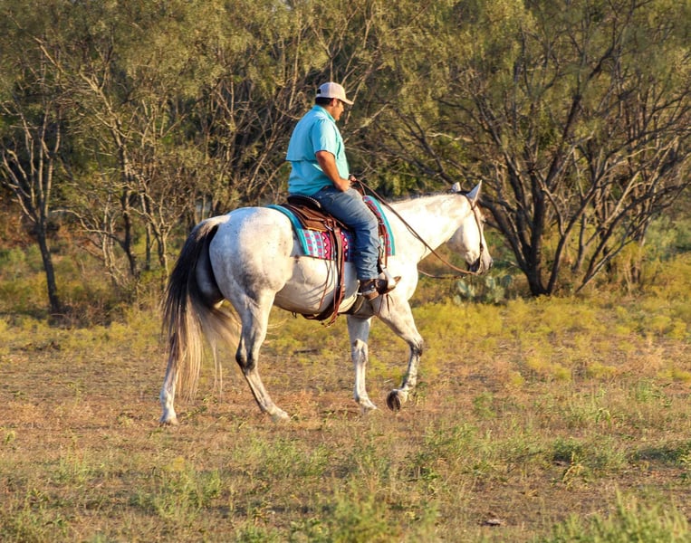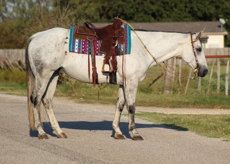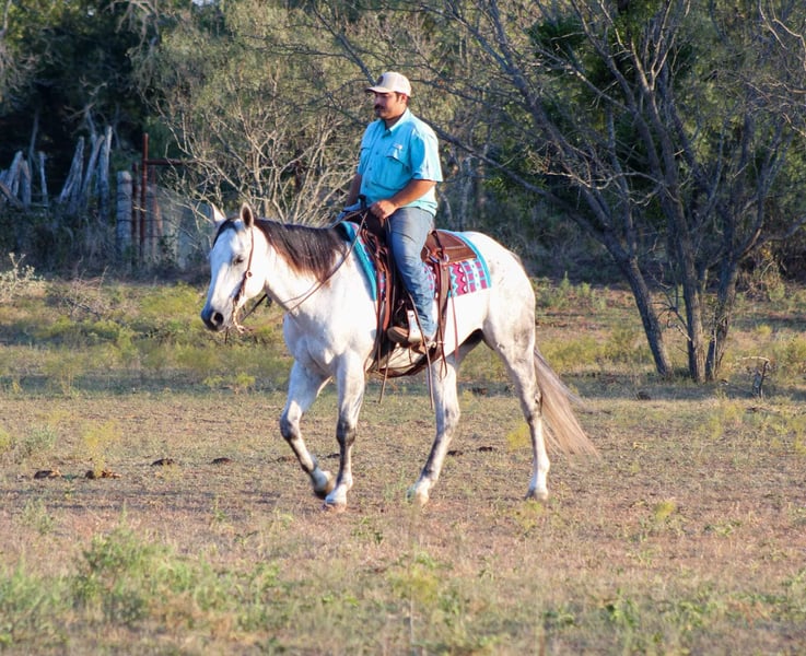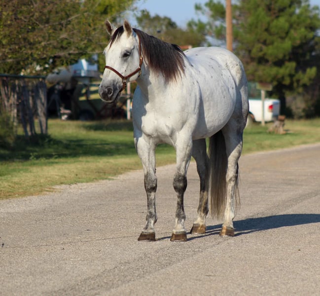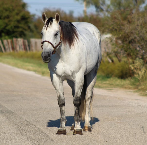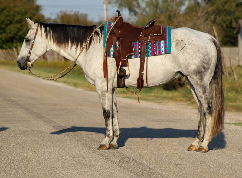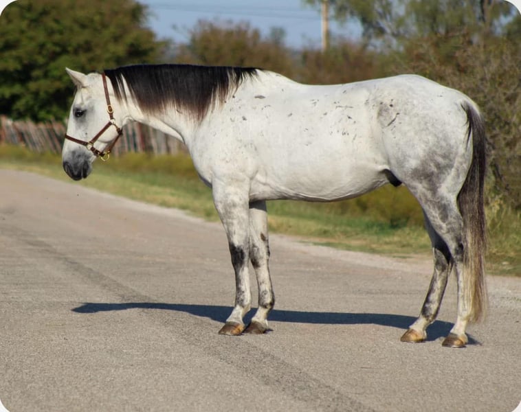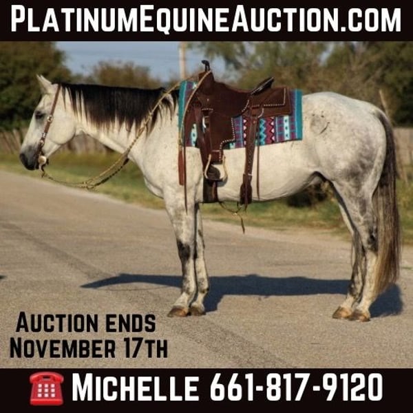 ONLINE AUCTION Place your bids at www.PlatinumEquineAuction.com Starting Bid $3500 Auction ends November 17th, 2024 Need a new saddle? Check out White Rock Saddles on our website or Facebook! You guys aren’t going to want to miss this BIG gorgeous grey gelding ! Dos as we call him is in the prime age of his life at 11 years old standing 15.2 hds tall. Dos is a true blue real ranch horse and has been used extensively on the ranch for all the ranch chores including doctoring sick cattle outside , loading trucks , gathering in steep country, checking fences . He is one you can run one down on in the pasture and know he will be strong to the horn . He has also been used a lot at the feed yard riding pens, doctoring and loading trucks. Dos is one handed broke , will lope right out of his tracks everytime , he has a good turn around and stop on him . He’s EXTREMELY well broke and would be a great candidate to take to the show pen in the ranch riding events , or go show him in the English also. Dos is a gorgeous mover, user friendly and BROKE like one should be. If you’re not looking for all the fancy stuff and just want your next trail blazer don’t worry Dos does that job just fine and is a blast out on the trail. Hes sure footed, he will go anywhere you point him down the trails, he will cross logs, bridges, water, train tracks, goes up and down any sized hills. He has also been rode numerous times out down the busy hwy and city streets with traffic including down at the historical Fort Worth Stockyards. Dos will not disappoint!! He’s everything people search for when looking for there new equine partner ! He is currently pastured with 3 other horses and gets along great in a herd or can be stalled also. He stands for the farrier, loads and unloads off the trailer like the seasoned veteran he is. Watch his video and you will fall in love!! Contact us to come try him, or we can set up a FaceTime also. If you need help with transport don’t hesitate to ask we have a list of reputable haulers that can get him safely to your doorstep world wide. Call M $ Performance Horses Michelle 661-817-9120 with any questions. Located in Stephenville, TX. ONLINE AUCTION Place your bids at www.PlatinumEquineAuction.com Starting Bid $3500 Auction ends November 17th, 2024 Need a new saddle? Check out White Rock Saddles on our website or Facebook!