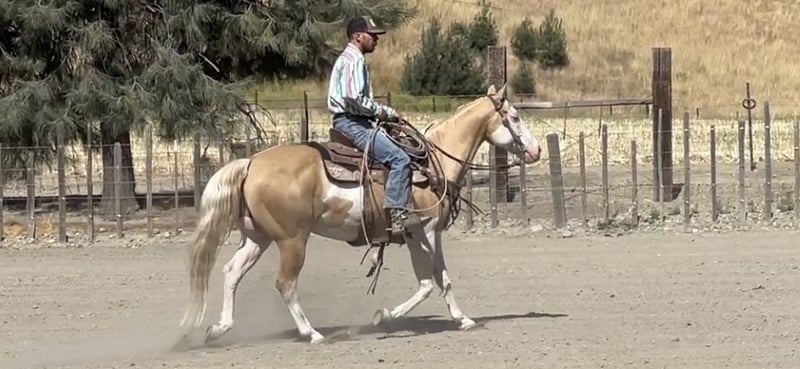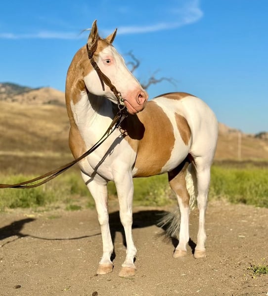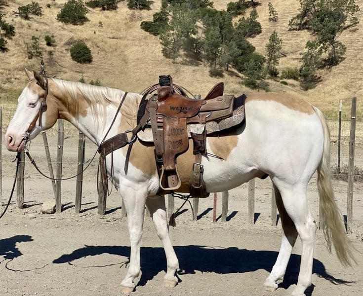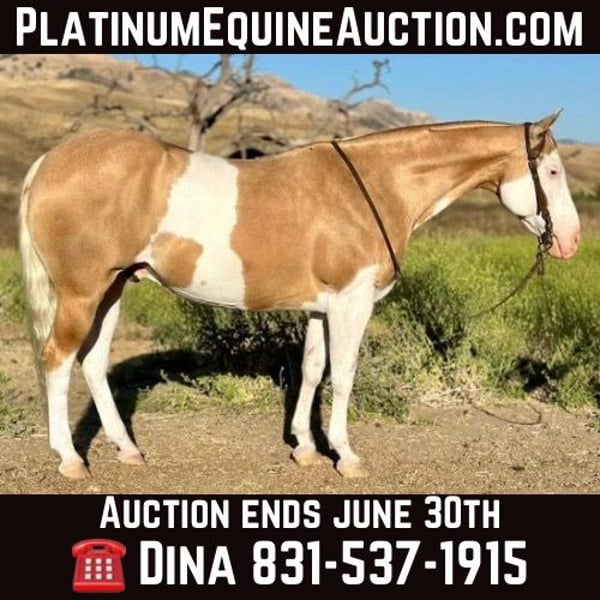 ONLINE AUCTION PLACE YOUR BIDS AT PLATINUMEQUINEAUCTION DOT COM $3500 STARTING BID AUCTION ENDS JUNE 30TH We are proud to introduce this beautiful palomino paint gelding. He is 11 years old,14.3 hands tall and picture perfect. Dice has everything you could want all in one package. Dice rides like one should low headed collected and very correct. Dice is a friendly, easy horse and is accommodating for all level riders. He is absolutely safe and knowledgeable horse and will adapt for his riders ability. He is luxurious, comfortable and stylish! He has a resume a mile long from every day ranch duties, to rodeos, head horse, family horse, sensible trail companion you name it he will do it. Dice is super broke spins, slides and has elegant transitions in his gaits. He has had natural horsemanship training and is very soft and supple on the ground as well as on his back. He gives off pressure very well he will flex both directions and at the poll. He is the kind of horse you can trust! He will run a cow down, then turn around put the kids on him and he will slow walk all day long he is the most versatile horse you will ever be lucky enough to swing your leg over. He is absolutely gentle. Dice side passes, pivots and has a rocking chair lope you can sit for days. He is good to catch great for the farrier, loads and unloads with ease, stands tied, easy to saddle and bridle. Dice has gathered cattle in steep country and will cross anything you may come across, brush, downed trees and cross the deepest water. Dice is amazing on the trail and just puts his head down and goes with the flow. He has been in some ranch trail and goes over the teetering bridge, over the tires, logs, covered wagon with ease and confidence. He has been rode down busy streets, carried flags and doesn’t mind tarps or balls whatsoever. Dice will fit the everyday cowboy or the leisurely trial rider. Due to his gentle demeanor he will fit a family that needs a horse that different abilities can ride. Dice is a very easy going gelding that makes him such a pleasure to have around. He is at the prime of his life and has so much knowledge it is truly priceless. Dice has absolutely no vices he is solid sane and an a very intelligent horse. We have truly enjoyed every minute of owning this beautiful gelding and he will be greatly missed. We know he will be the absolute barn favorite wherever he goes. He has a friendly disposition and will steal your heart. Please feel free to call and make an appointment to come meet him or with any questions you may have contact Longhorn Ranch Dina 831-537-1915 Located in Paicines Ca