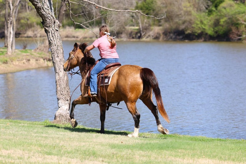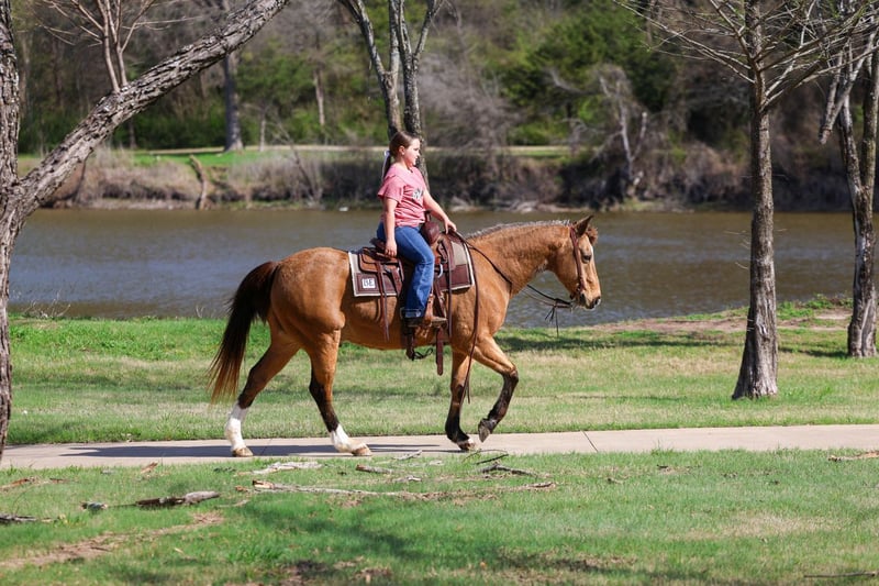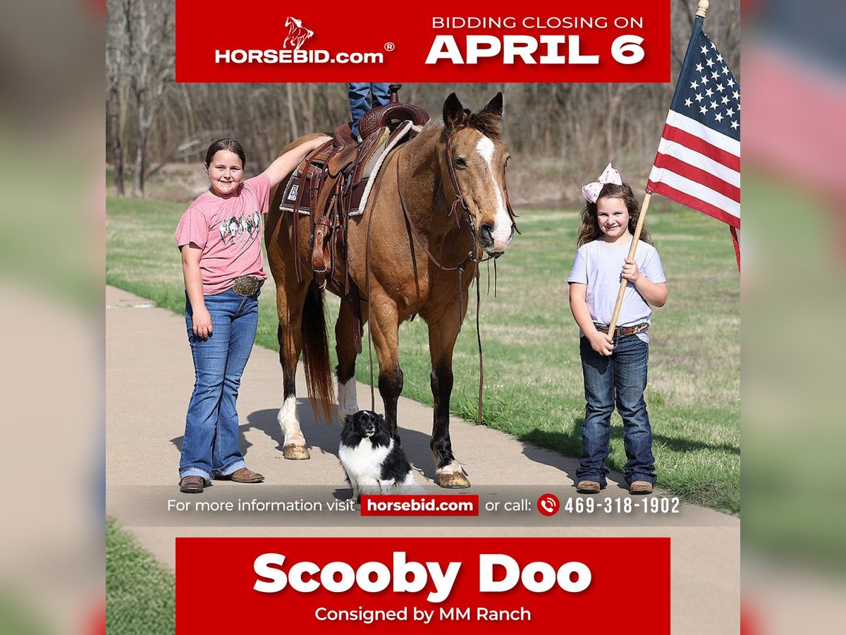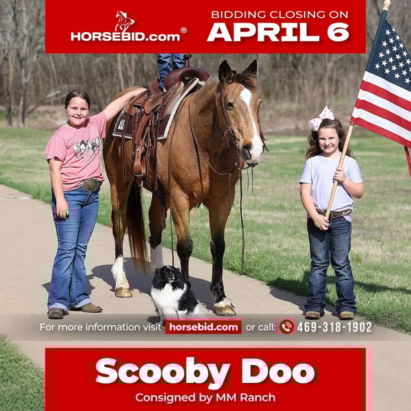 🌟𝑨𝒑𝒓𝒊𝒍 𝐀𝐋𝐋 𝐒𝐓𝐀𝐑 𝐋𝐈𝐍𝐄𝐔𝐏🌟 Happening now thru MONDAY | APRIL 6th - Available EXCLUSIVELY on HorseBid's website! For more details and to register visit: www.Horsebid.com CONSIGNOR CONTACT: MM Ranch 469-318-1902 LOCATION: Forney, TX BREED: Quarter Horse REGISTERED: No COLOR: Buckskin HEIGHT: 14 AGE: 14 GENDER: Gelding We are proud to introduce an absolute BABYSITTING UNICORN! One of those impossible to find little horses. Scooby Doo is the perfect little fun size gelding standing 14 hands tall. He has been part of our family and used by us. We know him both inside and out. Scooby Doo is a 14 year old buckskin gelding. He is just a fat and cute as can be. He has manners and all the fancy bottoms, he's as broke as broke gets and I would trust him with any kid, adult, grandma or grandpa, any age, beginner. Doesn't matter. You can ride him. I trust anyone can ride him anywhere, including BRIDLE-LESS! Absolutely NO kick or buck in him! Absolutely no bad habits! Absolutely no maintenance. He is simple, easy, and fun to ride. Plus is sure pretty to look at. He has been more miles and seen more country than most people! When I say he's been there and done that I mean it, he knows what a hard days work is outside in the country and will last all day. He is one handed broke, neck reins, and has a good stop! He has always been willing to go or do anything they have asked. He will ease thru the creeks/ponds, thickets, traffic safe, train safe, machinery safe, loud noises don't bother him. He's been to ropings, barrel races, jumping jumps, rodeos, spent many of long days working cows, dragging calves, hog hunting, swimming ponds, tied out camping, and been thru every aspect of the woods from thickets to boggy creeks, and trail riding down the roads. Trains honking and going by don't bother him, he will ride right next to it. He even rides ENGLISH! He has also been used to carry the American flag for the National Anthem at rodeos. He is BOMBPROOF, absolutely no spook at all and will go anywhere he is pointed, he never refuses or says no. He is a once in a lifetime time little horse. He is one of those that is as honest as the day is long. He's easy to catch, bathe, and hauls like a champ. He has the biggest heart and try of anything we have on the place. The kids themselves, saddle, bridle, and ride him everywhere with ZERO help from an adult. I trust this little horse enough for little kids to run up to him from the front or back and he will stand like a rock. You can go rope on him, pop bull whips, run barrels, run poles, goats tie, TRICK RIDE, breakaway, trail ride, shoot fireworks, etc…! Scooby will walk, trot, lope, or go as fast as you want in all the events. He is the coolest little guy around and everywhere we go he gets ALL the attention. He leads, loads, ties, bathes, clips, and stands for the farrier. I really can't say enough good things about him. Please don't hesitate to call us about Scooby Doo. We would love to talk to you about him. He sells 100% safe and sound in every way. He does have a pre evaluation in the pictures that was done by our vet. He is 100% ready to go to his new home. We can help with making shipping arrangements to anywhere.
