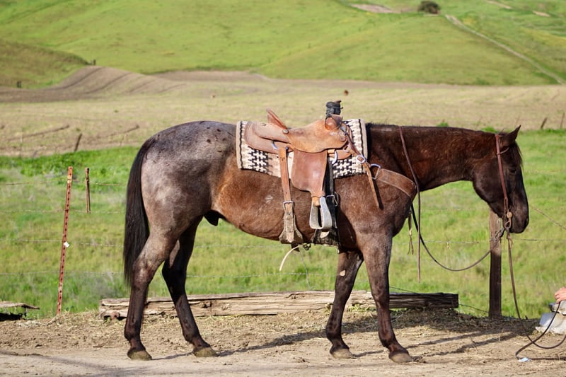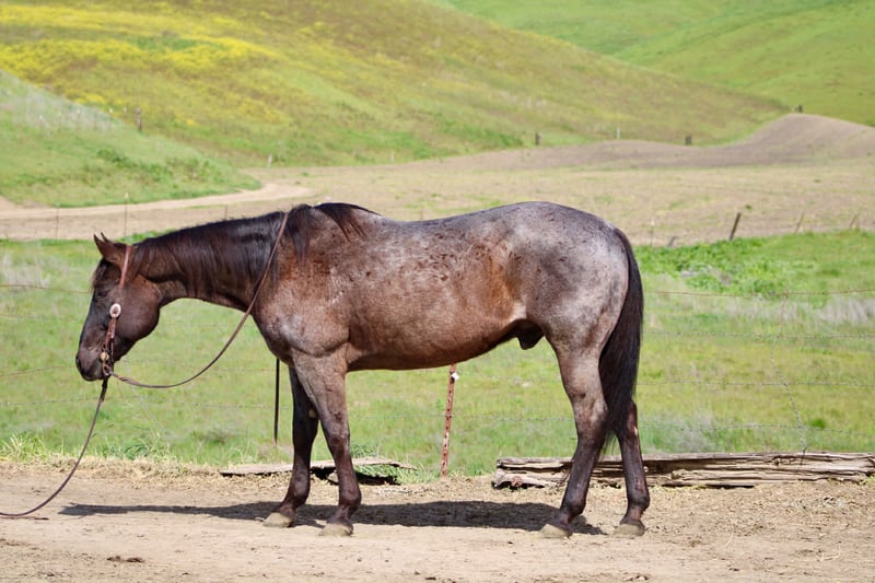 "AVAILABLE ON ONLINE HORSE AUCTION AT www DOT PlatinumEquineAuction DOT com BIDDING OPEN NOW thru SUNDAY | MARCH 15TH! *Final price will be determined on auction site* CONSIGNOR CONTACT INFO: Cheyenne Rey 831-537-8746 LOCATION: Bitterwater, CA Banker is a 14-year-old blue roan gelding. He stands 14.3HH and is large-framed, built how you would want one. Thick bone and wide feet. Banker is a true caretaker. He is safe for anyone, relaxed and easygoing always. He is super simple to handle and ride, easily making him the best match for any level to get along with. He’s been used as a dude string horse, making him tolerant to uneducated riders and handlers! He is alert and ready under saddle but has no spook, bolt, buck, or rear ever. He’s traveled down trails and roads with ease. He’s been seasoned to busy streets full of cyclists, pedestrians, and vehicles. Banker is sure-footed and crosses anything without hesitation. He’s been through deep waters, narrow bridges, and windy trails. Banker has a more whoa than go pace but is by no means lazy; he is comfortable to ride. Banker does great with time off and has zero silly business; he will never act different with days or weeks off. He is also just as simple in the arena. He W-T-L good circles, knows his leads, and will collect lightly at the poll. He has a good stop and knows the cue “whoa”. Banker stands for tacking, bathes well, and is good with his feet. Banker has zero issues and would be great for someone wanting a zero-nonsense, easygoing gelding that you can get on anytime with confidence knowing you don’t have to do any work. Just get on and enjoy your time horseback! Banker is located in Bitterwater, CA. For more info, contact Cheyenne at 831-537-8746.