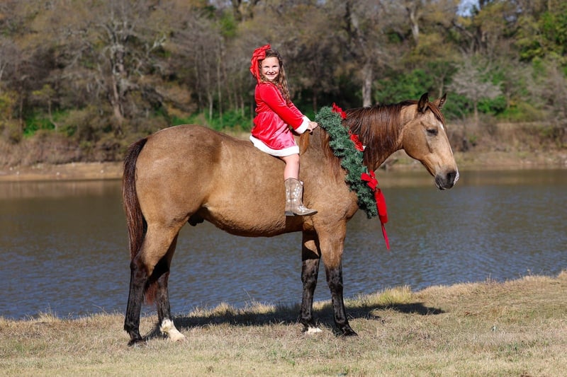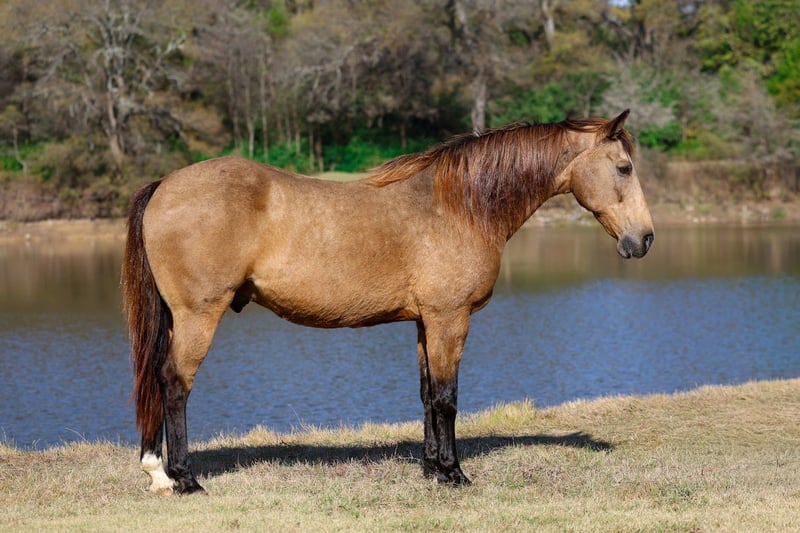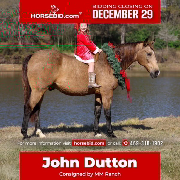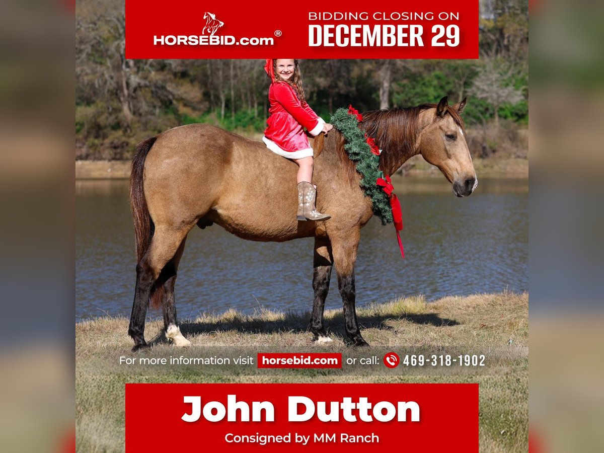 ⚜️𝐓𝐇𝐄 𝓗𝓮𝓻𝓲𝓽𝓪𝓰𝓮 𝐖𝐢𝐧𝐭𝐞𝐫 𝓒𝓵𝓪𝓼𝓼𝓲𝓬⚜️ Happening now thru MONDAY | DECEMBER 29th - Available EXCLUSIVELY on HorseBid's website! For more details and to register visit: www.Horsebid.com CONSIGNOR CONTACT: MM Ranch 469-318-1902 LOCATION: Forney, TX BREED: Quarter Horse REGISTERED: No COLOR: Buckskin HEIGHT: 15.1 AGE: 13 GENDER: Gelding This is the horse version of John Dutton off Yellowstone. So we named him after him. He is so unbelievably kind, soft eyed, straight to the point, no nonsense type of gelding. The kind that is reliable, steady, and seasoned. And he is right in the sweet spot of his life. He is ranch branded and tear branded. So we know he is a the perfect age of 13. He will still last a lifetime. Dutton has lived the real deal outdoor ranch life. He came off a 30,000 acre ranch in south Texas where he spent his whole life working for a living. He is a been there done that type because he has literally been there and done everything. He has been ridden across mountain ranges, hunted off of, and has packed gear through the great backcountry. (You can shoot a gun off his back.) He’s seasoned on week-long camping trips and knows how to travel big country with confidence and sure footedness. He crosses water, logs, bridges, brush, and terrain of every kind like he’s done it a thousand times—which he essentially has. Where most horses spook or hesitate around traffic, busy roads, trains, crowds of people, Dutton doesn’t even blink an eye at it. First time he ever seen a train, he stood right bedside it and wasn’t bothered by it. This gelding is as solid in town as he is on the trails. Ride him right down the street with cars buzzing past, trucks rolling by, and everyday commotion with confidence knowing he will not spook. He’s been down Main Street, through neighborhoods, and into busy areas without a single worry. Dutton has been around more cattle in his lifetime than you can imagine. He is a solid tired and true ranch horse. So if you want to rope or move your cattle around the ranch. Or let your kids learn to work cows and be safe while doing so. He is fun and easy to ride. That old fashioned broke type. You can ride him with a string around his neck. He is light and responsive. Absolutely does everything you ask him to do without hesitation. Dutton is an in-your-pocket, meet-you-at-the-gate kind of gelding. He’s soft, gentle, and genuinely enjoys people. Saddle him cold, saddle him warm, saddle him after time off—he stays quiet and honest. Rides bareback. He rides in a halter, hackamore, or bit, it doesn’t matter to him. Even if you are a complete beginner, you can ride him and enjoy him. Absolutely safe with no bad habits whatsoever. I can’t say that enough. It doesn’t matter if you have never owned a horse before. You can learn on this one. You can build your confidence. But if you are an advanced rider looking for safe you can enjoy him too. Stall him or turn him out—either way, he’s content and an easy keeper. Dutton is the full package with the kind of temperament people spend years searching for. If you want a bombproof gelding that the whole family can ride, in the mountains, on the streets, work the ranch, and babysit the kids —this is the one. Horses with this kind of experience and mileage don’t come up for sale often. He is up to date vaccinations, coggins, worming, feet, etc.. If you need help with transport don’t hesitate to ask. We will help you with that. Call with anymore questions about him.
