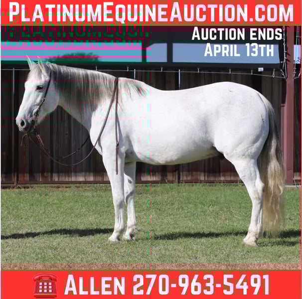 ONLINE AUCTION Place your bids at www.PlatinumEquineAuction.com Starting Bid $3500 Auction ends April 13th, 2025 Need a new saddle? Check out White Rock Saddles on our website or Facebook! This classy guy is just as pretty as he is smart. Caesar is quiet, gentle and easy to be around. Standing at 15.2 hands and 13 years old, grade. Caesar can be rode everyday, he is naturally athletic, he loves to go and wants to please. You can let him sit and pull him out to take on a stroll down the highway with your favorite dog by your side. He will be the same honest guy every time. Caesar excels out in the country, crosses through lakes, and rivers. Climbs or squeezes wherever you point him. Covers miles and happy to do it with you! He walks, trots, and lopes off with ease. He also rides collected and with buttons if you want! Finished head horse, been rode by a 6+. Has plenty of run and rates good. He can go any direction, your next ranch horse, performance horse, or noble trail steed. Caesar loves pets, snacks, bubble bathes and going places! Loads and unloads in anything. Hauls quiet, with geldings or mares, big or small. He hauls like a dream. He has four solid black feet. He is tough! Caesar stands tied all day, gets fat off anything. Easy keeper! We absolutely encourage any one to come try and see how great he is for yourselves, but we are also able to arrange shipping anywhere from Hawaii to Canada and any state in the U.S. He is located in Lipan Texas Please Call or text A&M Livestock Allen 270-963-5491 for more information. ONLINE AUCTION Place your bids at www.PlatinumEquineAuction.com Starting Bid $3500 Auction ends April 13th, 2025 Need a new saddle? Check out White Rock Saddles on our website or Facebook!