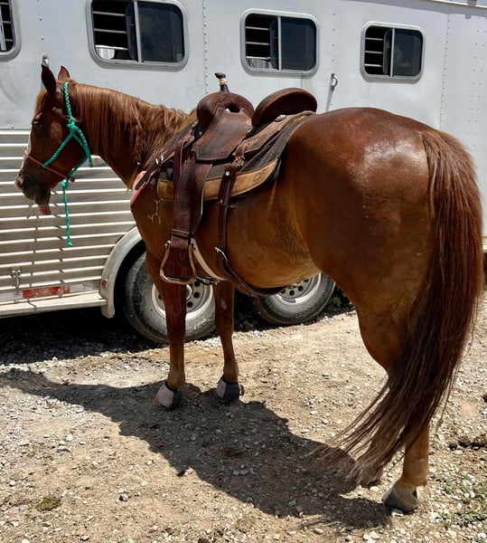ONLINE AUCTION Place your bids at www.PlatinumEquineAuction.com Starting Bid $3500 Auction ends April 13th, 2025 Need a new saddle? Check out White Rock Saddles on our website or Facebook! Chimuelo aka “Chimmy” is absolutely one of a kind. He’s a 14 yr old, 14.1H grade sorrel gelding with a personality as big as Texas. Chimmy is a very easy going, gentle gelding that will go anywhere you point him. He absolutely ZERO spook, buck bolt or rear and is just plain EASY to get along with. I’ve had this gelding over a year. My original hopes were to make him a barrel horse, and while he’s not too shabby in the barrel pen, he’s much happier out on trails or working cows. Chimuelo is easy to handle and will neck rein and move off leg. He’ll ride in any bridle, or hackamore and has a heart that aims to please. I know this gelding inside and out and don’t have one negative thing to say about him. You’ll attract attention everywhere you go and will stand for hours while you and your friends use him as the most hilarious photo prop. When Chimmy was younger, he was kicked in the front of his mouth, knocking out his bottom right teeth. When relaxed, he let his tongue hang out his mouth. This DOES NOT effect the way he eats or drinks and is still able to graze, eat alfalfa cubes and grain normally. It is simply just the most noticeable attribute about him and only highlights his fun living character. Chimmy has a huge heart and being loved on and paid attention to is his favorite thing. This is why it’s only fair I find him a home a new person who has time to do so. He’ll take you anywhere you want to go, in town, on the trail, parades, through water, over logs, you name it and he’ll be your ride or die. I’ve used him primarily to pleasure ride, sit on at ropings, ride in town, and run barrels occasionally. He’s one you can jump on anytime you want and just go. Chimmy is utd on feet, teeth and coggins and is ready for his new home. He loads, leads, bathes, and ties perfectly and is a no bs, easy going guy! We will be sad to see him go! More pics and videos on his website page at northtexashorsecompany.com/chimmy. Please call Blair with North Texas Horse Company for more info at 817-757-3046. We are located in Weatherford, TX and can help arrange affordable shipping to anyone!! ONLINE AUCTION Place your bids at www.PlatinumEquineAuction.com Starting Bid $3500 Auction ends April 13th, 2025 Need a new saddle? Check out White Rock Saddles on our website or Facebook!