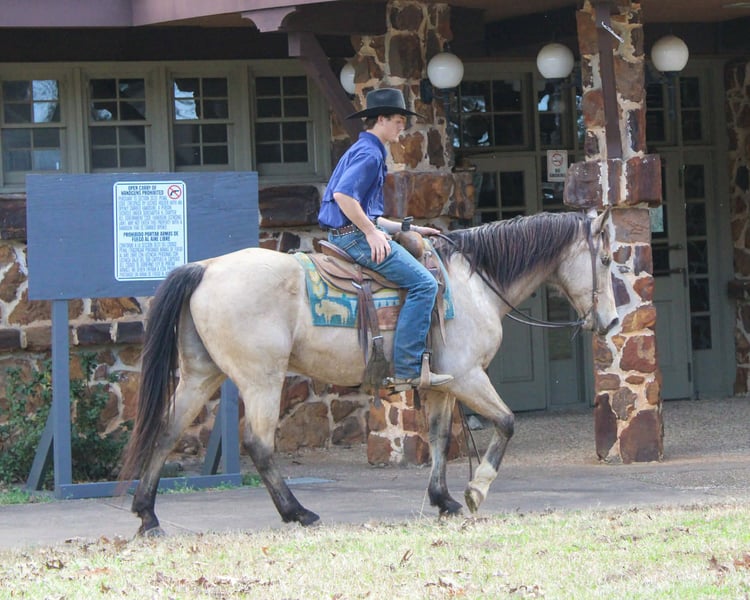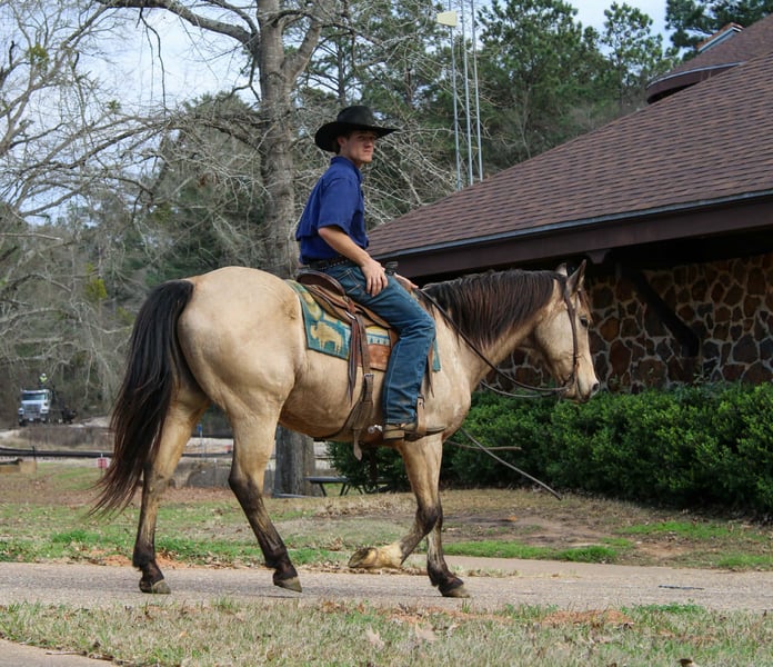 "AVAILABLE ON ONLINE HORSE AUCTION AT www DOT PlatinumEquineAuction DOT com BIDDING OPEN NOW thru SUNDAY | MARCH 8TH! *Final price will be determined on auction site* CONSIGNOR CONTACT INFO: Rileigh Dinges 979-362-0756 LOCATION: Cushing, TX King is a 15 year old buckskin gelding he stands 15 hands tall. He is a super gentle and quiet to be around. He has spent a lot of time on the ranch for all aspects of ranch work, he has been used by the whole family from the little kids to being used to rope and doctor outside. He has also been trail rode all over, he crosses the creeks, bridges, logs and goes anywhere he is asked! King has also been rode in town, he is not spooky and handles new situations very well! If you’re looking for a super nice all around gelding be sure to check him out!