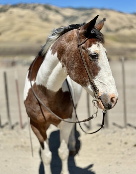 ONLINE AUCTION Place your bids at www.PlatinumEquineAuction.com Starting Bid $3500 Auction ends June 16th, 2024 Need a new saddle? Check out White Rock Saddles on our website or Facebook! Meet potato he is a 13 year old roan paint standing just under 15HH. This horse is as solid, and honest as they come. He is the definition of a baby sitter. He has done just about everything you can do horseback. Ranch, trail, rope. He is an absolute solid ranch gelding. You can tie off on him in the pasture doctoring cattle, gather the toughest country and is great in the branding pen. Potato is one you can trust with the most timid beginner riders, knowing he will take care of whoever is on his back. Potato is superb out on the trail he will go anywhere and you can drop your reins and he will follow any trail. This horse is safe for grandmas, husbands and the most precious of cargo. This is a horse the entire family can enjoy. When you look up bombproof in the dictionary there’s a picture of Potato! He will be the most trustworthy, knowledgeable horse that has a been there done that attitude. Potato has also been roped on out of the box and can head and heel. He is the safest horse on busy streets and is used to all types of machinery. Potato is great in the arena he rides nice and correct neck reins picks up his leads and is honest as the day is long. There isn’t anything you can’t do on this horse. Potato is not scared of the flag flapping around him. The tarp blowing in his face or the ball bouncing on his back. He has been in some trail courses and does great. Potato has been on overnight camping trips and will be absolutely one you can depend on to be safe and reliable mount for anyone. This horse has so much experience to share with his rider he is remarkable and worth his weight in gold! Potato is eager to please and pokes along with the most inexperienced riders or picks up the pace for the more advanced. Potato is easy to catch, tack up and groom. He is great for the farrier loves baths and the first to greet you at the gait he’s like a big puppy. He is the most laid back horse, he is truly amazing. He has zero issues and is maintenance free. He stalls or is great out in a pasture setting as well. Nothing and I mean nothing, will bother this horse. He has never blinked an eye at anything and never will! He is located in Bitterwater, CA. For more info please call or text Cheyenne Rey 831-537-8746. ONLINE AUCTION Place your bids at www.PlatinumEquineAuction.com Starting Bid $3500 Auction ends June 16th, 2024 Need a new saddle? Check out White Rock Saddles on our website or Facebook!