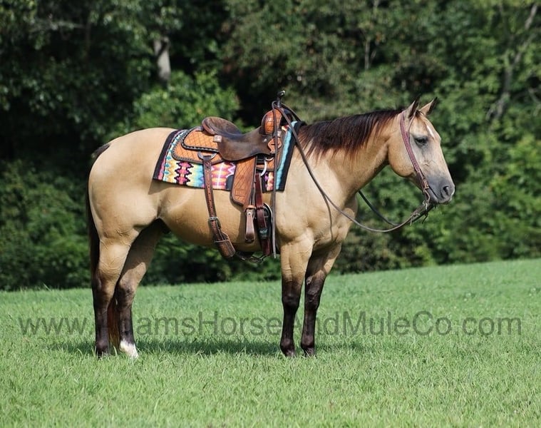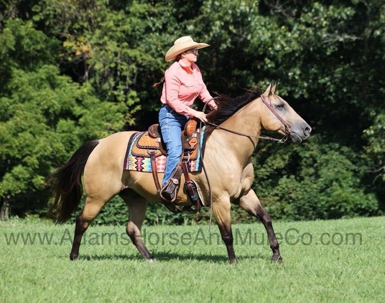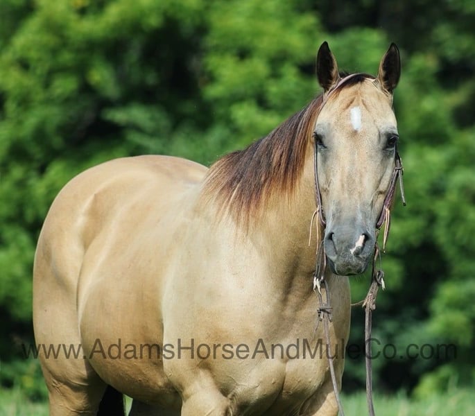 Go to www.AdamsHorseAndMuleCo.com for more pics and a video. AHAMC has been in the horse business and sold horses over the internet since 2005. We have a long track record of success with hundreds of happy customers. We work hard to match riders with the correct horses and specialize in beginner safe, family friendly horses that have been used and checked out by our family! Snack Pack is a stout built buckskin horse standing 14.3hh. He is a 2011 model registered AQHA gelding! Snack is the perfect horse for the whole family to enjoy! The kids have played on him for hours and he is very tolerant as he is a confidence builder, slow and easy is his preferred speed! He is a trail horse deluxe that will mosey along down the trails and he will never be in a hurry! He will cross creeks, ditches, logs and navigate rough rocky areas. He is safe riding in traffic. He has a very smooth lope, has a good stop, turns a circle both ways and backs with ease! Snack knows his way around the ranch and when asked he can go get the work done as well. Snack is a confident horse on the trails and will lead the crew, head out alone with no issues! He has been exposed to all kinds of wildlife such as deer or turkey or other animals like cows or dogs and will go anywhere that he is asked too. He has been rode many miles in the mountains of Eastern Kentucky and encountered every obstacle possible on the trail. He will go up or down even the steepest slopes, across deep creeks, over downed trees, and over all types of rough terrain while still being sure footed. Snack is not cinchy, cold backed, does not crib or weave. Snack is sure to be the family favorite for years to come!!! Feel free to call Eric 606-308-2461 with any questions.