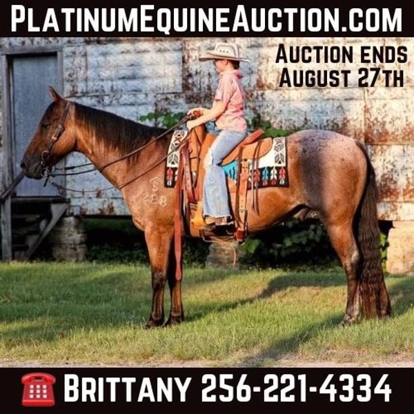 ONLINE AUCTION Place your bids at www.PlatinumEquineAuction.com Starting Bid $3500 Auction ends August 25th, 2024 Need a new saddle? Check out White Rock Saddles on our website or Facebook! Jake is an all around gelding that is 14 years old 14.2 hands tall! He is the one the whole family has used and anyone can get along with! He is one you can jump on and take any direction! He has been trail ridden hundred of miles and used to gather and sort cattle. He has been hauled to youth rodeos for the goat tying, breakaway roping, poles and barrels… he is one that can do it all! The best part about him is that he is super safe even for the most timid rider! Don’t miss your chance to own one like Jake! Please contact Brittany Little 256-221-4334 for any more information! Located in Mt. Hope, AL. ONLINE AUCTION Place your bids at www.PlatinumEquineAuction.com Starting Bid $3500 Auction ends August 25th, 2024 Need a new saddle? Check out White Rock Saddles on our website or Facebook!