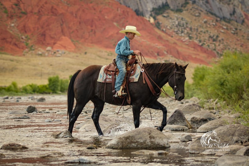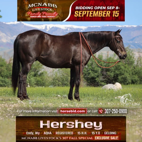𝕄ℂℕ𝔸𝔹𝔹 𝕃𝕀𝕍𝔼𝕊𝕋𝕆ℂ𝕂's 🍂𝟑𝟎𝟕 𝐅𝐀𝐋𝐋 𝑺𝒑𝒆𝒄𝒊𝒂𝒍🍂 Happening now thru MONDAY | SEPTEMBER 15th - Available EXCLUSIVELY on HorseBid's website! For more details and to register visit: www.Horsebid.com CONSIGNOR CONTACT: McNabb Livesetock LLC 307-250-0900 LOCATION: Cody, Wy BREED: AQHA REGISTERED: Yes REGISTERED NAME: Oil Pull Ike COLOR: Black HEIGHT: 15 AGE: 15 GENDER: Gelding The kids love his name, Hershey because of his chocolaty brown color. They believe he looks like the color of a candy bar. He is just a sweet as one too. Hershey is that steady Eddie horse that everyone needs weather you are looking for your first horse, your last horse, or kids horse Hershey is your guy. Hershey is that super sweet ranch gelding that anyone can get along with. He’s gentle, kind, easy to catch and enjoys being around you. We purchased him from a neighbor who was forced to retire from riding only due to her health. We purchased her last 3 horses and she didn’t want to sell, he was truly loved and he took such excellent care of her. This is the kind of horse that everyone is looking for, the one that no one wants to sell. She had owned him for 8yrs. We have had him in our program for the past 6 months and he has been exactly everything she loved. He’s solid and seasoned down the trail, no vices, no bad habits. Give him time off and just go have a fun ride. No nonsense. He has been ridden alone for miles up in the mountains, he’s just solid and dependable. He’s also happy to ride in a group, not buddy sour, gets along with all the other horses. Hershey is truly a horse of a lifetime. We put the most beginner, timid riders on him and they have so much fun. Hershey is a confidence booster. He’s the whole package, if you need him to do a ranch job he’s been there and done that, if you want him to go for a trail ride, he’s hassle free and if you need him to babysit the grand kids he’s the one for the job. Hershey has always had excellent care and handling. He has had a basic PPE, up to date on worming, dental and farrier. We welcome you to do your own PPE and to come to the ranch a to meet Hershey. We also are glad to help arrange transportation. We will hold the horses at no charge for a reasonable amount of time to get hauling arranged. For more information call 307-250-0900. We have lot more great stories we are glad to tell you Hershey.