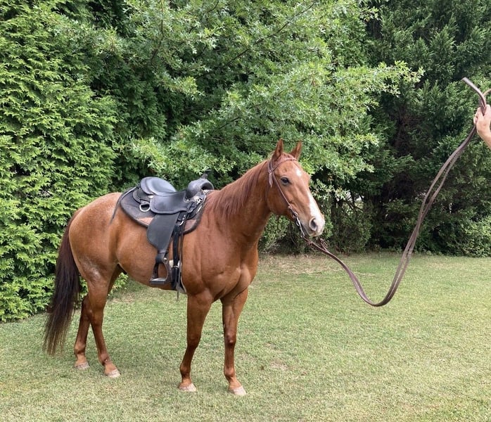 Beau is a sweet, gentle, red roan gelding Quarter Horse