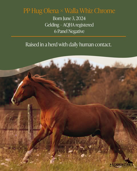 View the photos to discover the story of “Chevy” – Whiz Spat Of Crome. Born June 3, 2024 – Gelding – AQHA registered – 6 Panel Clean A smart, grounded young gelding with reining quality in his blood. Calm, sensitive, and so honest he touches your heart right away. He thinks along with you, stays composed, and grows a little stronger in balance each day. Raised in a natural herd with calm, space, and daily human connection. 📍 Remmington’s Ranch – Arendonk (BE) www.remmingtonsranch.be ------------------------------------------------------------------------------------- Bekijk in de foto’s het verhaal van “Chevy” Whiz Spat Of Crome. Geboren 3 juni 2024 – Ruin – AQHA ingeschreven – 6 panel clean Een slimme, stabiele jongeman met reiningkwaliteit in z’n bloed. Rustig, gevoelig en zó eerlijk dat hij je meteen raakt. Hij denkt met je mee, blijft kalm in zijn hoofd en groeit elke dag een stukje meer in balans. Opgegroeid in kuddeverband met rust, ruimte en dagelijks contact met de mens. De vraagprijs voor chevy is : €10.500 excl. btw 📍 Remmington’s Ranch – Arendonk (BE) www.remmingtonsranch.be