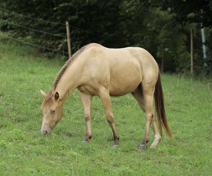 "Kizz" is a super sweet, friendly young QH gelding who thinks he is more of a dog than a horse. He is very easygoing and does everything expected of him, loves children, and enjoys cuddling a lot. He is a small gelding with a height of about 1.40m, yet he is harmonious and has a strong build appropriate for his size, with short, sturdy legs. Due to his small size and his very affectionate character, he makes the perfect companion for children, teenagers, and light small adults who do not want to feel overwhelmed on a horse. Kizz is growing up in a herd environment appropriate for his age and is very well socialized, healthy, sure-footed, and robust. 6 Panel N/N.