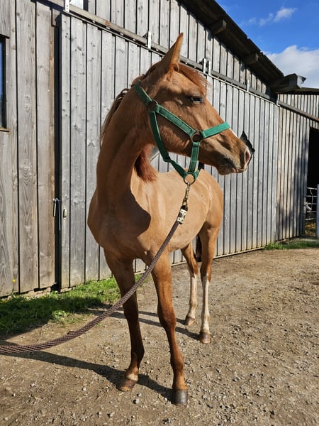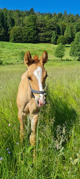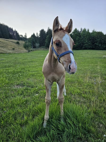 Very pretty Quarter Horse colt in the special color Red Dun. Very bright and cheeky. Well-built. Clear head. Awesome movements. Father successful in sports. Awesome lineage. Both parents 5 Panel N/N. Can move out at the end of the year or stay with us for further rearing.