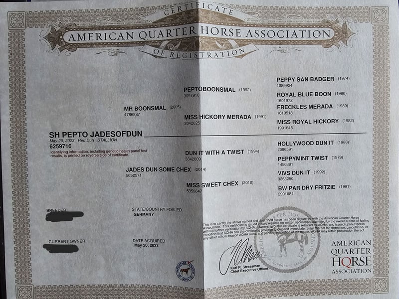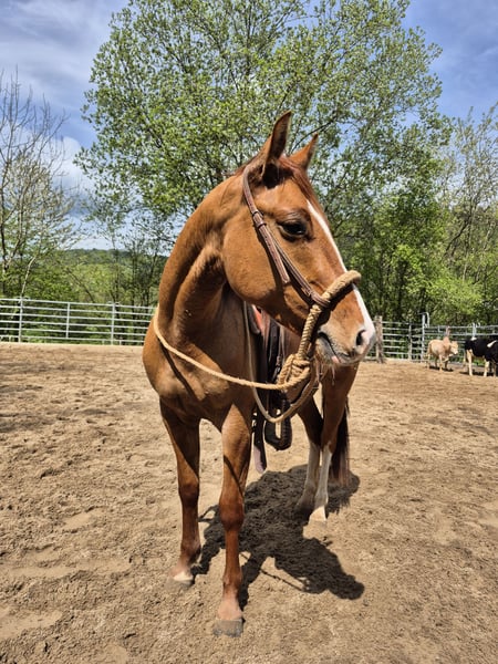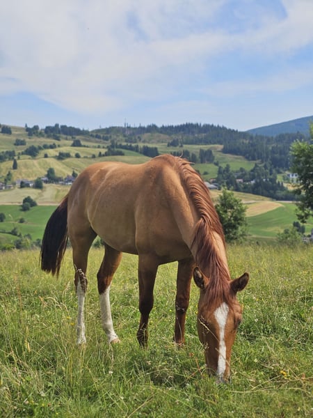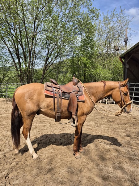 Cookie 2- feiner Wallach in der Sonderfarbe red dun. Ruhig im Umgang. Richtig entspanntes Pferd. Klarer Kopf. Tolle Bewegungen. Rinderarbeit kein Problem. Wächst im Herdenverband auf. Opa erfolgreich im Cutting Sport (Peptoboonsmal). Super Abstammung. Für den Sport geeignet und natürlich auch für ambitionierte Freizeitreiter. Beide Elternteile 5 Panel N/N. **Das Betreten des Hofes und der Weiden des Betriebes für Besichtigungen sowie das Reiten von Verkaufspferden erfolgt immer auf eigene Gefahr! Ausschluss jeglicher Gewährleistung! Für das Probereiten unserer Verkaufspferde berechnen wir 50€. Dieser Betrag wird beim Kauf eines Pferdes wieder verrechnet.**