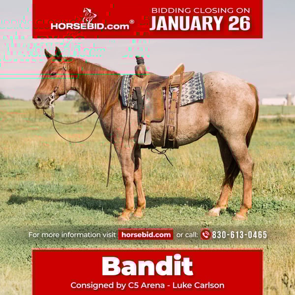 𝐉𝐀𝐍𝐔𝐀𝐑𝐘 ⭐️𝑨𝒍𝒍 𝑺𝒕𝒂𝒓 𝑳𝒊𝒏𝒆𝒖𝒑⭐️ Happening now thru MONDAY | JANUARY 26th - Available EXCLUSIVELY on HorseBid's website! For more details and to register visit: www.Horsebid.com CONSIGNOR CONTACT: C5 Arena - Luke Carlson 830-613-0465 LOCATION: Decorah, IA BREED: AQHA REGISTERED: Yes REGISTERED NAME: DOC PEPTO LEGGITT COLOR: Red Roan HEIGHT: 14.2 AGE: 3 GENDER: Gelding Bandit is a STUNNING 3 year old red roan gelding with excellent confirmation and quiet demeanor. His pedigree shines through in his incredible mind and talent with legends like Peptoboonsmal, Shining Spark, One Time Pepto, and Yellow Roan of Texas. Bandit neck reins on a loose draped rein with his head low and at the age of three, his mind far exceeds his years. He is laid back and not concerned about anything going on around him. Tarps, obstacles, and other scary objects are of no concern. Bandit is always so willing to perform any task. If you are looking for your next rope or ranch horse, Bandit is cowy, and loves to put his hind end in the ground! He has been lightly started on the heel side and breakaway. He has been started slow and correct. He shows loads of potential to be a big time calf/heel horse and is also gentle enough for youth/low number ropers to finish out. Bandit is 100% sound and sane. He stands 14.2+HH with great shape weighing 1,100lbs. Whether you need a trail riding, arena, or ranch partner, he will be your guy! For any questions or more information regarding this talented gelding, please reach out to Luke 830-613-0465.