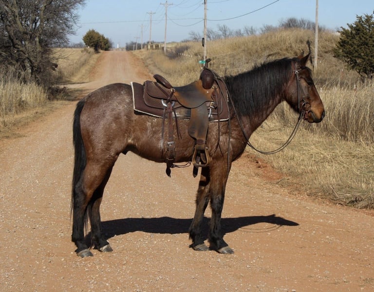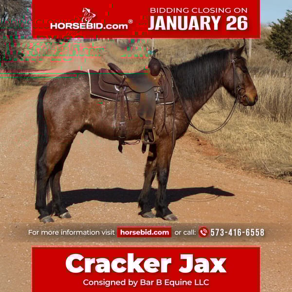 𝐉𝐀𝐍𝐔𝐀𝐑𝐘 ⭐️𝑨𝒍𝒍 𝑺𝒕𝒂𝒓 𝑳𝒊𝒏𝒆𝒖𝒑⭐️ Happening now thru MONDAY | JANUARY 26th - Available EXCLUSIVELY on HorseBid's website! For more details and to register visit: www.Horsebid.com CONSIGNOR CONTACT: Bar B Equine LLC 573-416-6558 LOCATION: Owensville, MO BREED: QH X REGISTERED: No COLOR: Bay Roan HEIGHT: 14.2 AGE: 4 GENDER: Gelding Cracker Jax is a 4 year old 14.2 hand bay roan crossbred gelding. Jax has been ranched on nearly every day in the wide Oklahoma country, chasing wild horses and gathering cattle from all ends of the pasture. When needing to unmount for any reason, you don’t even need to worry about tying! Jax is a seasoned veteran in the ground tying aspect. He is a horse I never have to worry about being any different than he was the day before. He has shown his true color to us time and time again, and that color is striking gold through a bay roan coat! If plodding around cattle isn’t quite your criteria, Cracker Jax has been ridden English in and out of the arena as well. Going down the trails and over the jumps, he’s proven himself capable of all! Speaking of arena, Jax shows heavy interest in arena work, picking up each lead with ease and having one of the smoothest one step short lopes I’ve ever ridden! He has been played around with on the barrels and poles, and has been hauled to several playdays/funshows. In the pasture, Jax gets along with others well and sets lower on the totem pole. He has been pastured with a variety of different animals including mares, geldings, young horses, donkeys, goats, and even a zedonk! Jax also does not mind your typical farm animals such as dogs, cats, or chickens. He is not fearful of loud noises like machinery or vehicles and has been deemed traffic safe! Cracker Jax enjoys the trails and will cross any obstacle placed in front of him. He is no stranger to deep waters and steep inclines. This young horse has handled everything with total ease and confidence, and truthfully we hate to see him go! But, we are excited to see what setting Jax ends up in and how many smiles are to come with! If you’re looking for an honest, young horse to end your search- Jax fits all the requirements for any styled rider. Any questions big or small, please reach out!