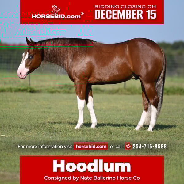 🎄𝐓𝐇𝐄 𝑯𝒐𝒍𝒊𝒅𝒂𝒚 𝐂𝐋𝐀𝐒𝐒𝐈𝐂🎄 Happening now thru MONDAY | DECEMBER 15th - Available EXCLUSIVELY on HorseBid's website! For more details and to register visit: www.Horsebid.com CONSIGNOR CONTACT: Nate Ballerino Horse Co 254-716-9588 LOCATION: Waco, TX BREED: AQHA REGISTERED: Yes REGISTERED NAME: HF SMOOTH CRIMINAL COLOR: Sorrel HEIGHT: 14.3 AGE: 3 GENDER: Gelding HF Smooth Criminal aka Hoodlum is an extreme athlete, he has untouched Talent, a huge personality and all the brains,looks and ability to go far in anyone’s program. He has spent a year in reining training and is super easy to operate. Hoodlum has a huge deep sliding stop, correct classy spins, and a perfect rocking chair lope. He is extremely trainable and is lightly started on the calf Sled. Hoodlum is RIATA BUCKLE ELIGIBLE. Please call Nate Ballerino at 254-716-9588 with and questions. Nation wide shipping is available.